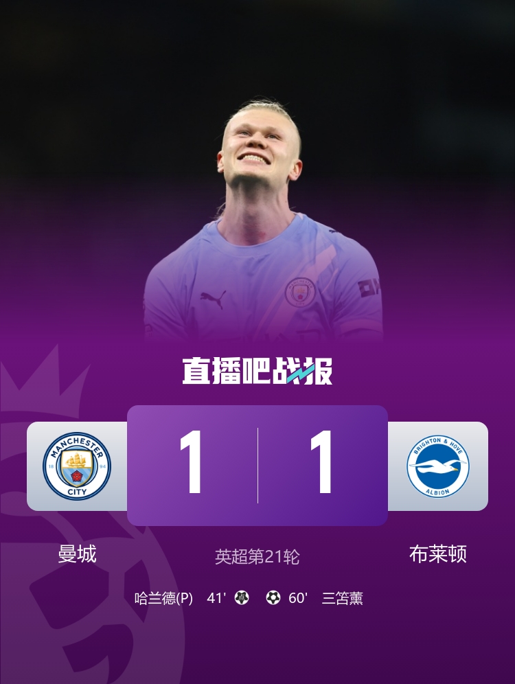 3连平!曼城1-1布莱顿先赛距榜首5分哈兰德点射+失良机多库造点