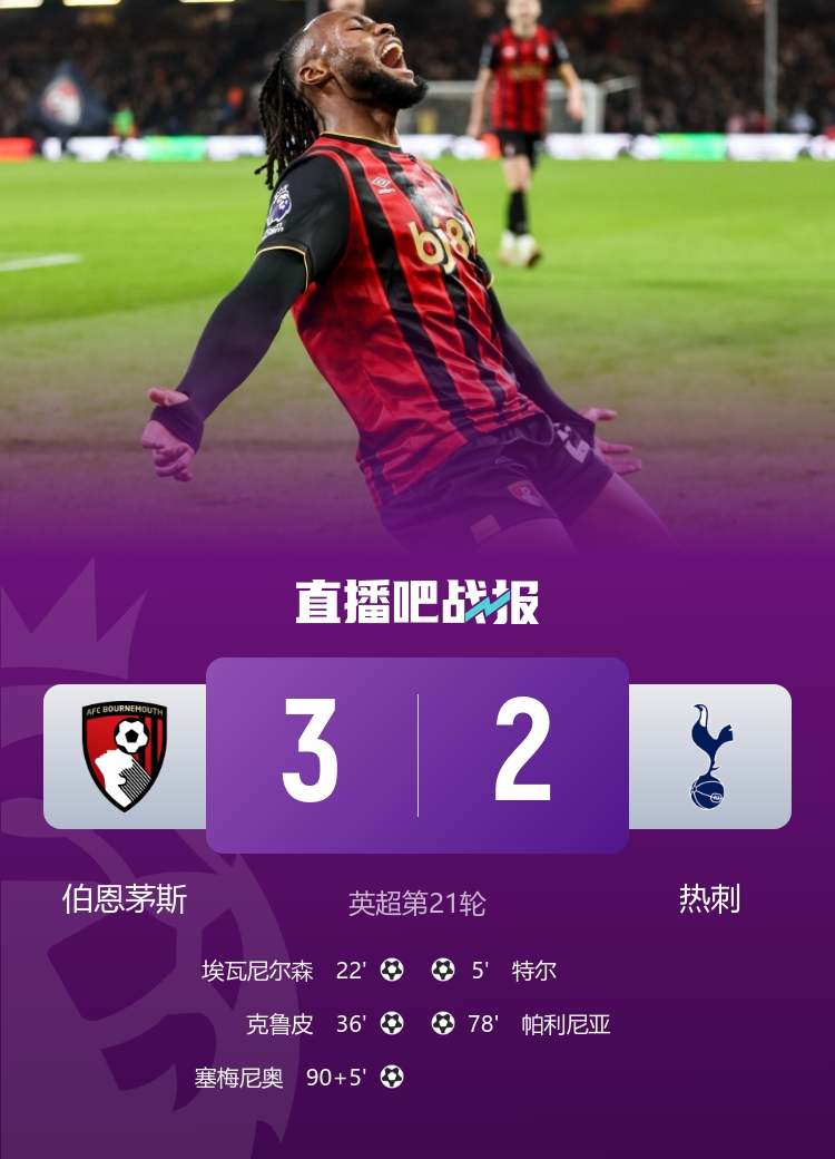 遭绝杀!热刺2-3伯恩茅斯近6轮仅1胜帕利尼亚倒勾塞梅尼奥绝杀