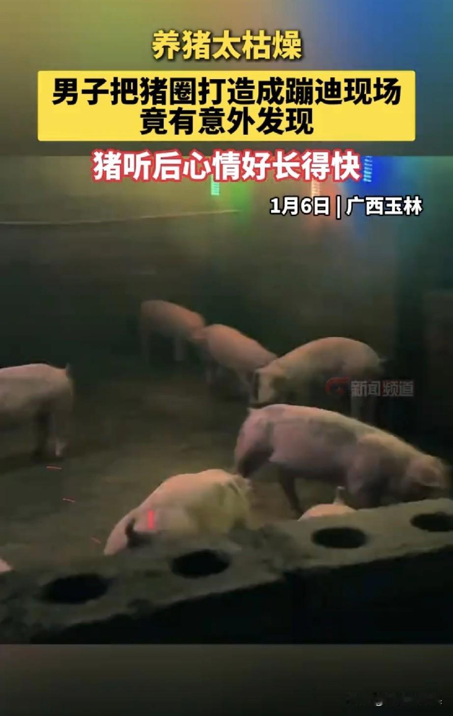 谁能想到现在的猪都过上“蹦迪养老”生活了!广西95后养猪户庞先生,嫌十年养猪生涯太枯燥,直接豪掷3000块给猪圈整上DJ音响和彩灯,把养殖场改成了“猪界夜店”。 本来只是想给自己解闷,结果意外发现——小猪崽们听着动感DJ,居然从蔫蔫的“躺平选手”变成了“蹦迪达人”,不仅围着猪圈撒欢跑,干饭也贼猛,长肉速度直接开挂! 网友笑疯了:“现在猪的待遇比我都好,我还在挤地铁,它们已经在蹦迪了”“这猪怕不是出栏时都能摇着花手走”。 其实这操作还真不是瞎闹,适宜的音乐能缓解猪的应激反应,庞先生这波误打误撞,愣是把“养猪”玩成了科学养殖的新花样。只能说,年轻人的脑洞,果然能把平凡工作玩出花! 你觉得这些小猪最爱听哪首DJ?评论区说说你的脑洞~