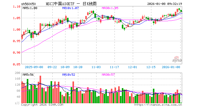 1月8日,MSCI中国A50ETF(560050)开盘跌0.09%,报1.083元。MSCI中国A50ETF(560050)重仓股方面,宁德时代开盘跌0.81%,紫金矿业跌1.42%,工业富联涨0.25%,贵州茅台跌0.00%,海光信息涨1.46%,寒武纪涨1.01%,比亚迪跌0.41%,恒瑞医药涨1.80%,立讯精密跌0.92%,中际旭创跌1.37%。