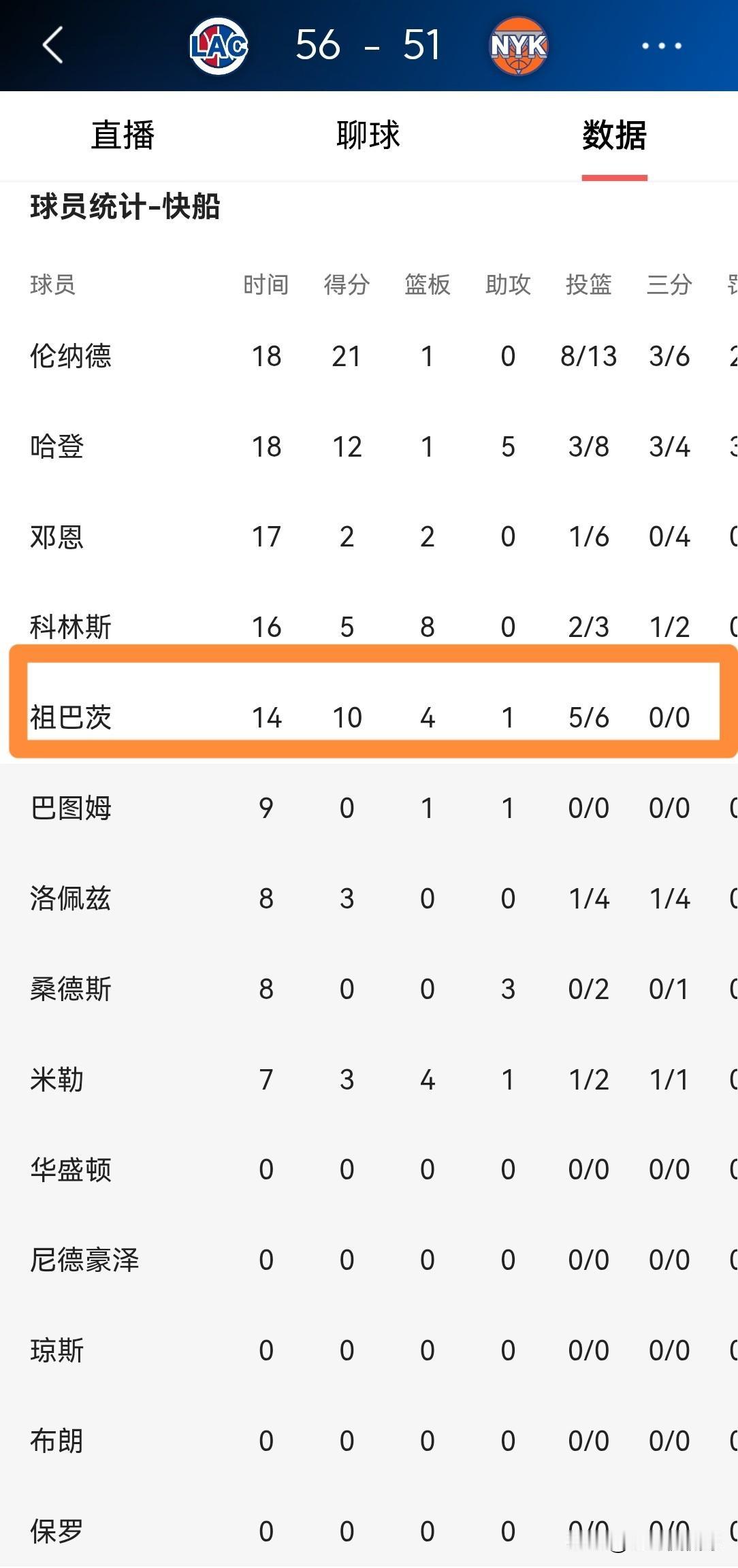 我必须要怒赞快船中锋祖巴茨!在今天快船客场挑战尼克斯的上半场比赛中,祖巴茨在攻防两端展现出了超强的侵略性,他首发出战14分钟,投篮6中5得到10分4篮板,他的场上正负值为+7,帮助球队以56:51领先尼克斯结束了前两节的比赛。 坦白说,快船能否赢下本场比赛,就要看祖巴茨能不能在下半场比赛中延续自己的表现,只要祖巴茨能够继续打出高效表现,那么快船就很有可能获胜。