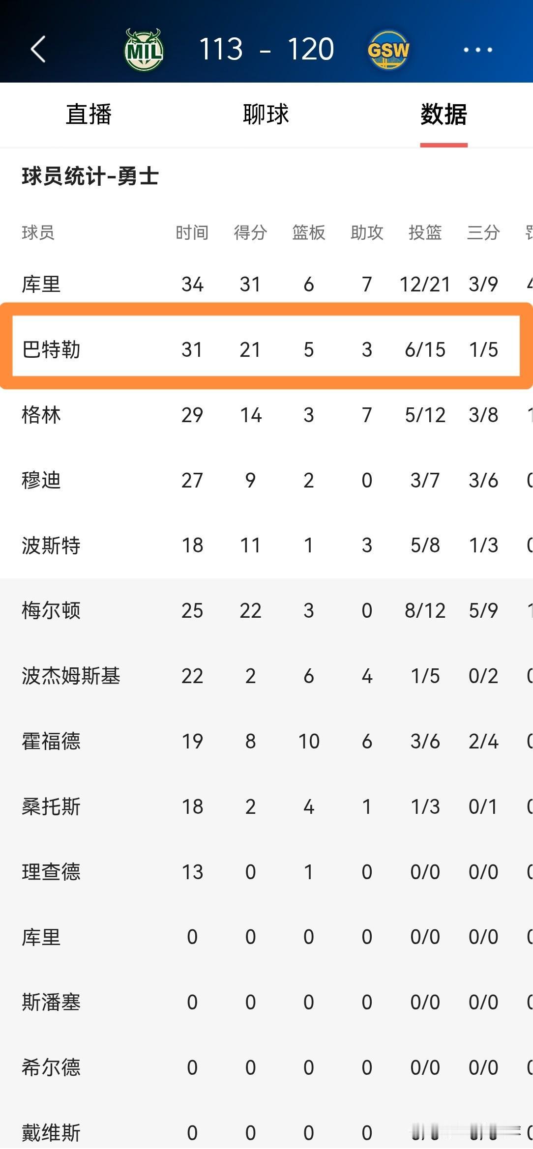 谁能拯救一下勇士巨星巴特勒的三分球?在今天勇士主场以120:113击败雄鹿的比赛中,巴特勒在三分线外手感冰凉,他在首发出战的31分钟里,投篮15中6,其中三分球5中1、罚球9中8得到21分,还有5篮板3助攻1抢断,他的场上正负值为-4。 作为当今联盟的超级巨星,巴特勒最让人诟病的就是他的三分球,他的三分球命中率一直以来都比较低。