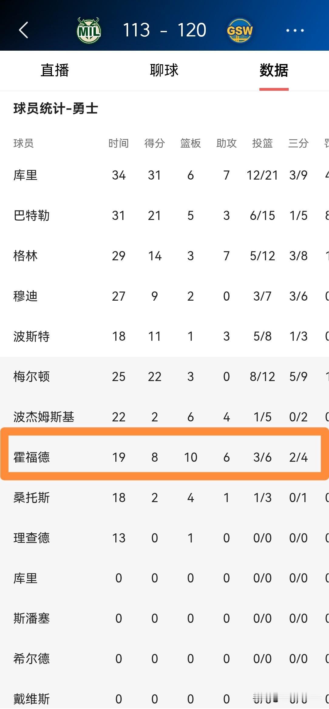 我一定要好好夸夸勇士老将霍福德!今天勇士在主场以120:113战胜雄鹿,本场比赛39岁的霍福德在攻防两端都打出了无可挑剔的表现。 整场比赛下来,霍福德替补出战19分钟,投篮6中3,其中三分球4中2得到8分10篮板6助攻2盖帽的全能表现,他的场上正负值为+9。 今天的霍福德真是太出彩了,他几乎做到了勇士希望他做到的所有事情,无论是拉开空间投篮、拼抢篮板、组织策应,还是篮下的防守。