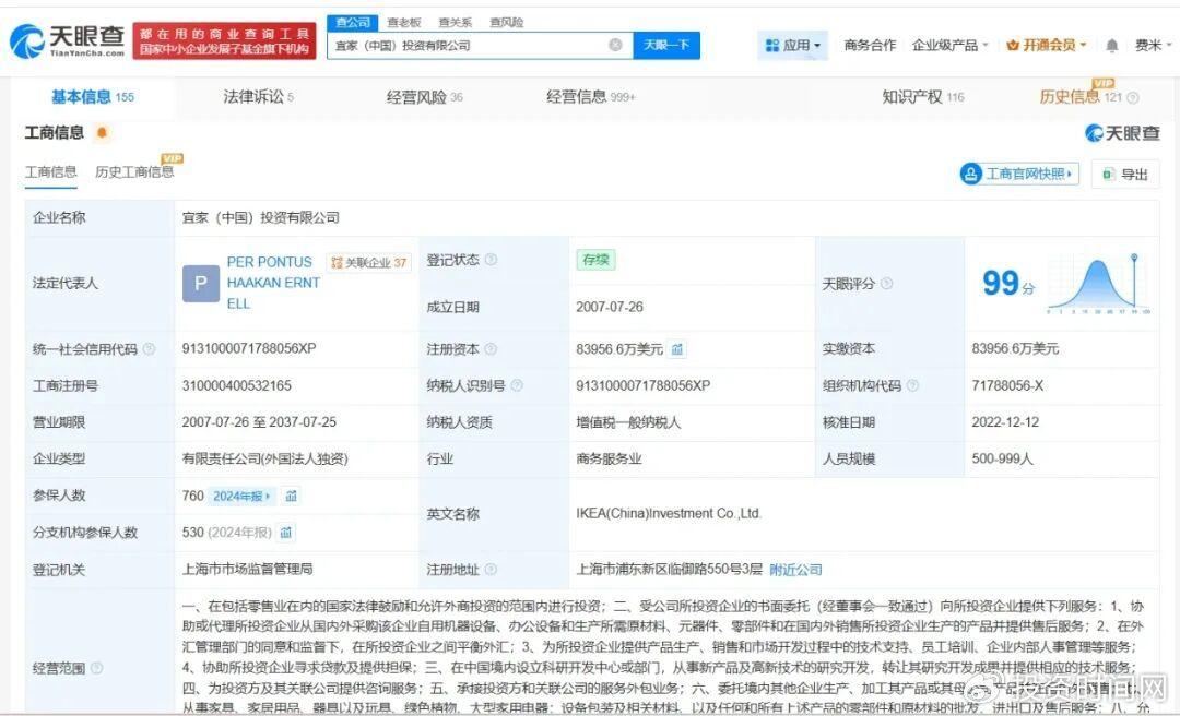 天眼查工商信息显示,宜家(中国)投资有限公司成立于2007年7月,法定代表人为PERPONTUSHAAKANERNTELL,注册资本约8.4亿美元,经营范围包括在包括零售业在内的国家法律鼓励和允许外商投资的范围内进行投资等。股东信息显示,该公司由INGKAPROHOLDINGB.V.全资持股。对外投资信息显示,该公司对外投资42家企业,其中39家处于存续状态,长春宜家家居有限公司、宜家家具配件(深圳)有限公司、北京宜家咨询有限公司已注销。