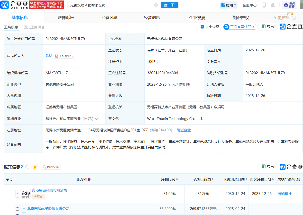 企查查APP显示,近日,无锡筑芯科技有限公司成立,法定代表人为陈浩,经营范围包含:集成电路设计;集成电路芯片设计及服务;集成电路芯片及产品销售;计算机系统服务;软件开发等。企查查股权穿透显示,该公司由赛微电子(300456)旗下青岛展诚科技有限公司等共同持股。