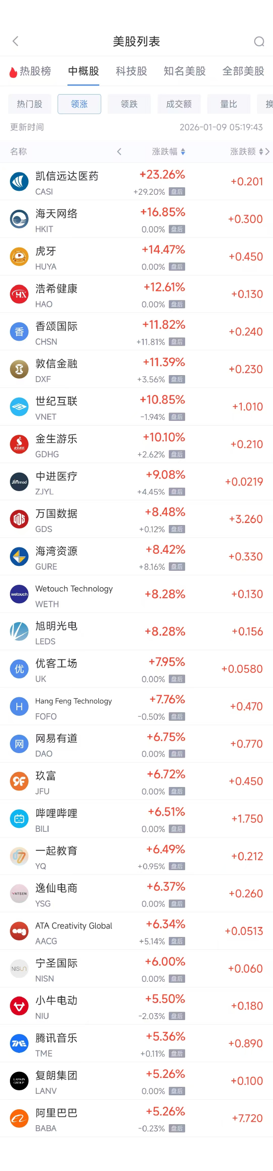 上涨股当中(按市值从高到低),阿里巴巴涨5.26%,拼多多涨0.52%,网易涨0.23%,携程涨0.87%,京东涨2.20%,中华电信涨1.22%,腾讯音乐涨5.45%,富途控股涨1.70%,贝壳涨2.97%,小鹏汽车涨3.37%,中通涨1.80%,华住酒店集团涨2.27%,中国新城农村涨2.25%,哔哩哔哩涨6.51%。