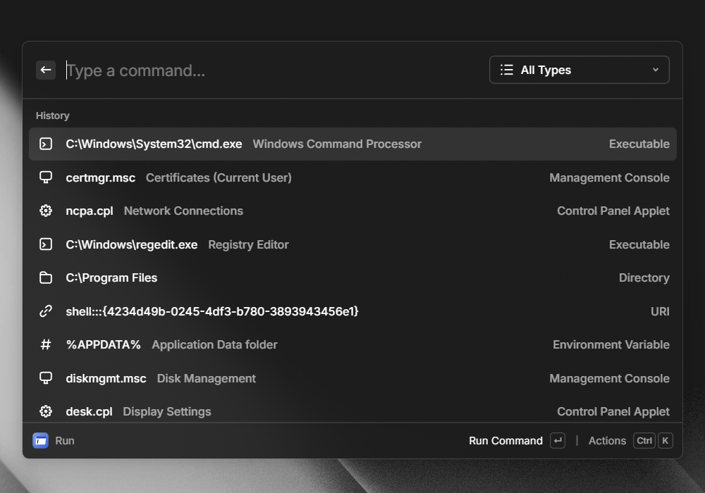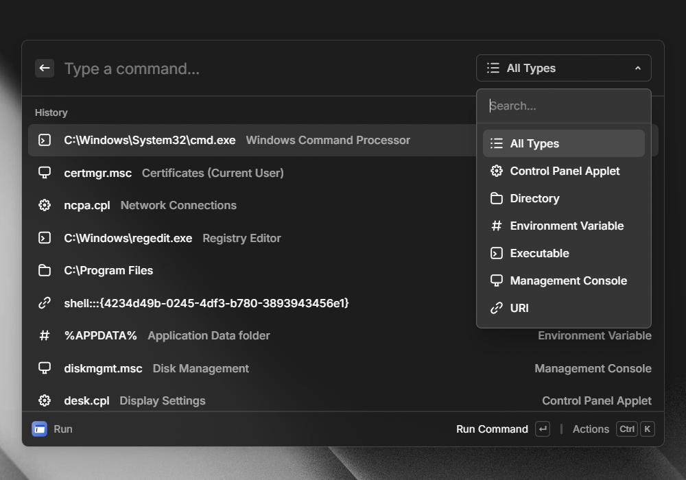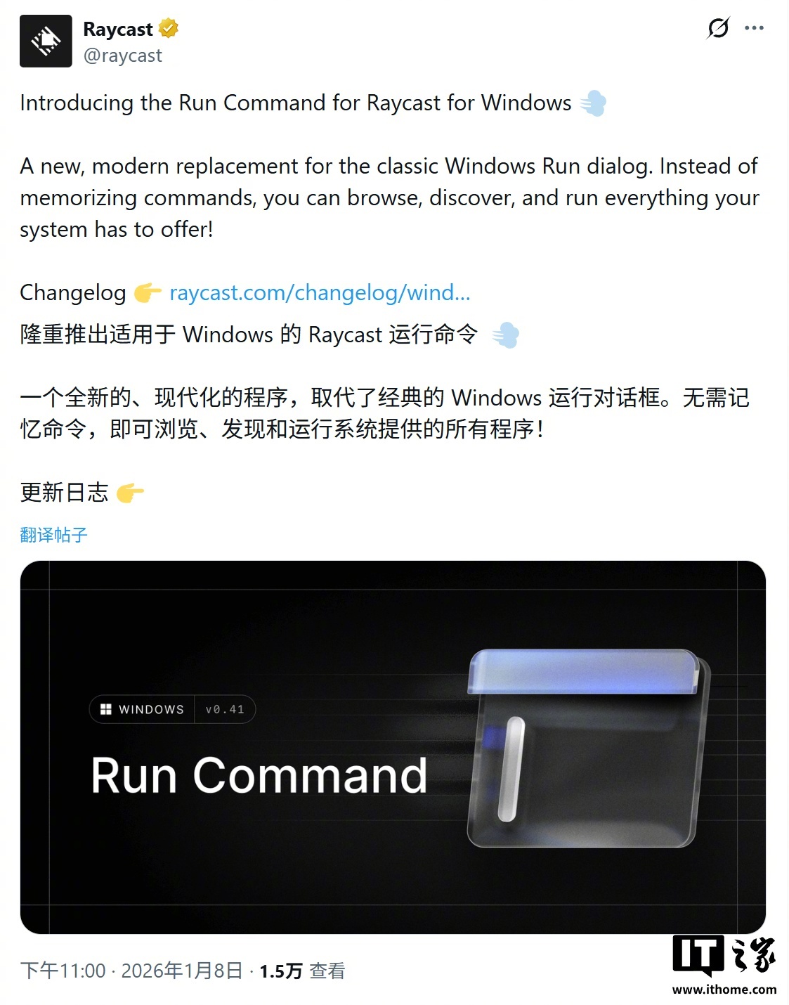 [Win+R超级进化:Raycastv0.41发布,为Win10/Win11带来现代化“运行”窗口]科技媒体NeoWin昨日(1月8日)发布博文,报道称适用于Windows10、Windows11的效率工具Raycast发布0.41版,引入了深度现代化的“运行”(Run)对话框功能,旨在替代Windows系统沿用多年的原生“运行”窗口。