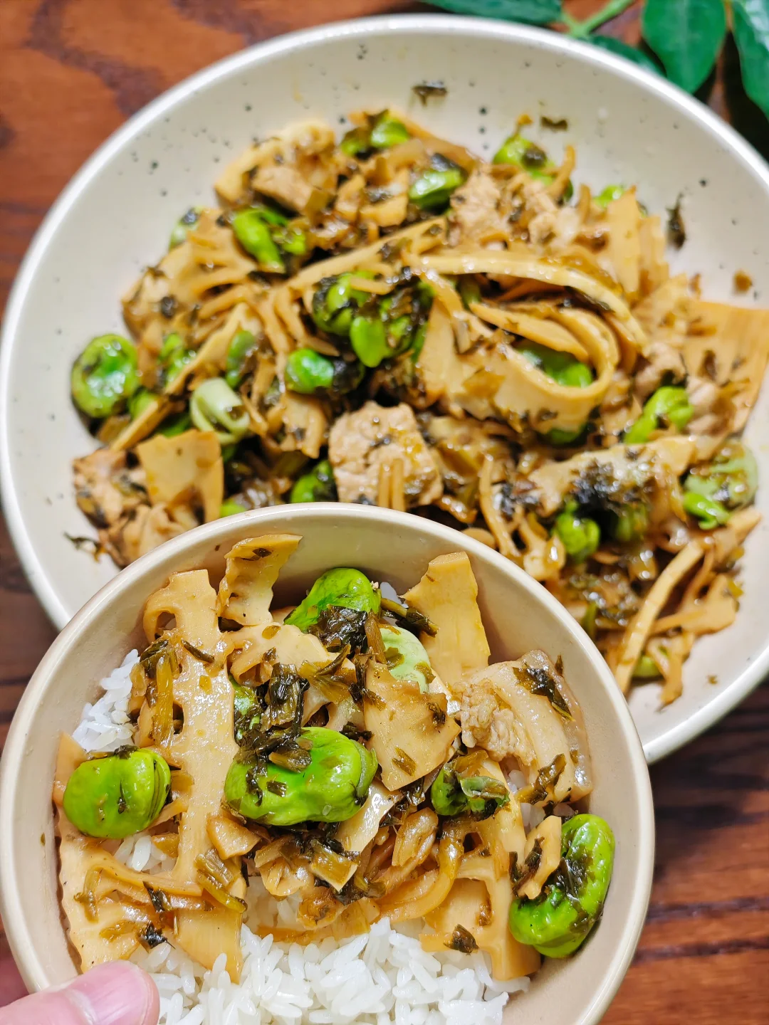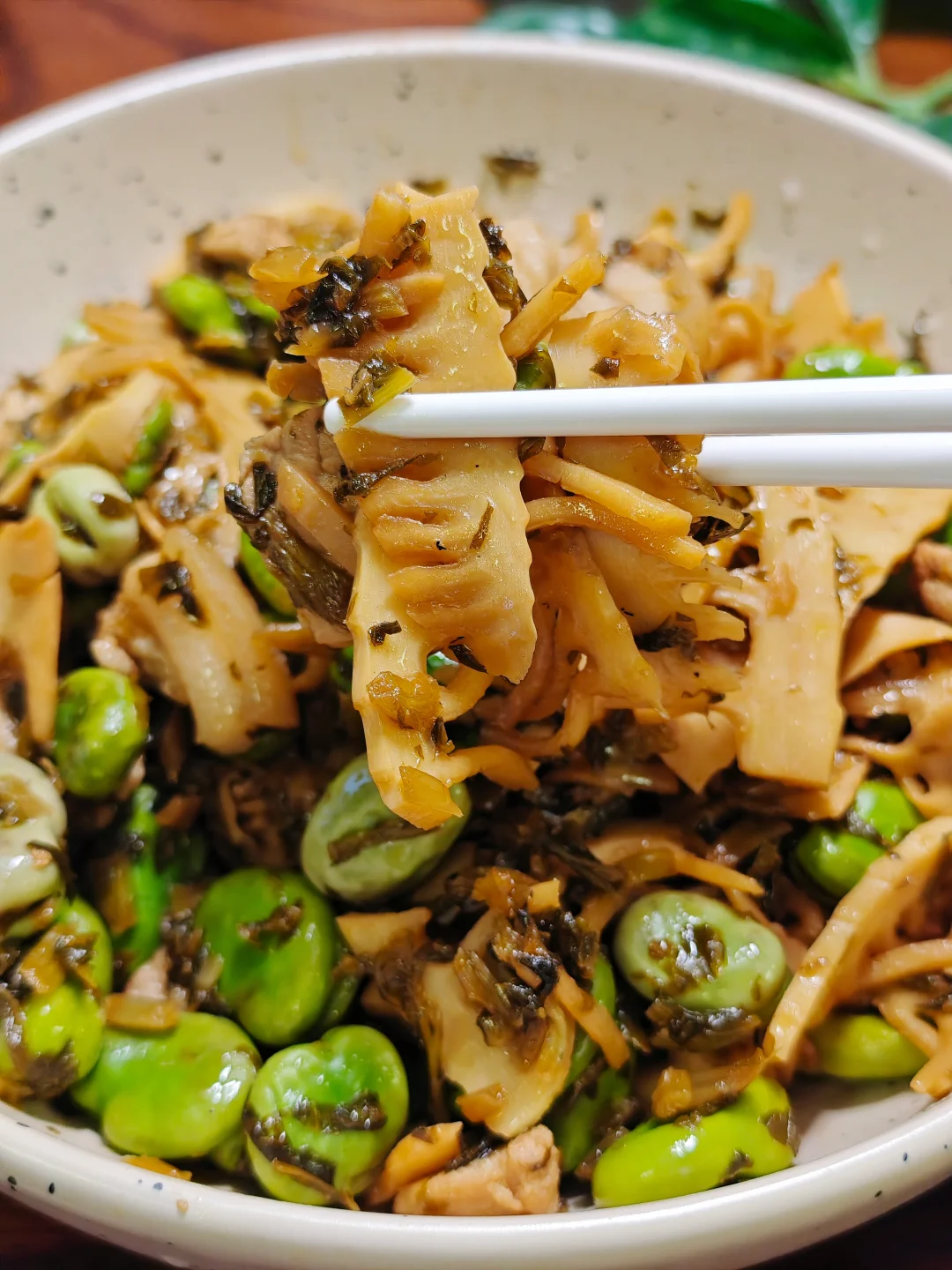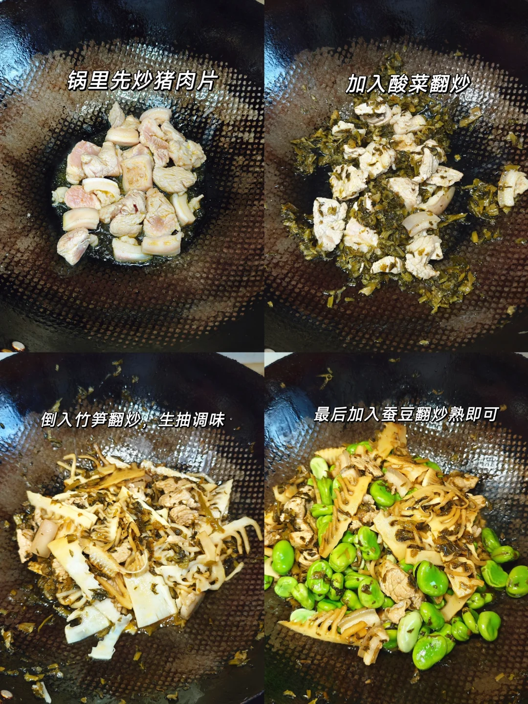 春笋酸菜炒蚕豆,真的很适合春天的,做法简单,吃起来也是巨巨巨香的,超级下单!!! 🌵准备食材 春笋、蚕豆、酸菜、猪肉 🌵做法 1⃣️蚕豆剥好,水烧开焯水蚕豆1分钟;如果是新鲜竹笋,也需要焯水5分钟去酸涩味。(我直接市场上买的包装笋) 2⃣️锅里热油,加入新鲜猪肉片翻炒,多炒一会煸出油脂更香,加入酸菜翻炒。 3⃣️加入竹笋翻炒一会,用生抽调味。 4⃣️最后加入蚕豆翻炒至熟就可以啦,可撒一些胡椒粉调味。