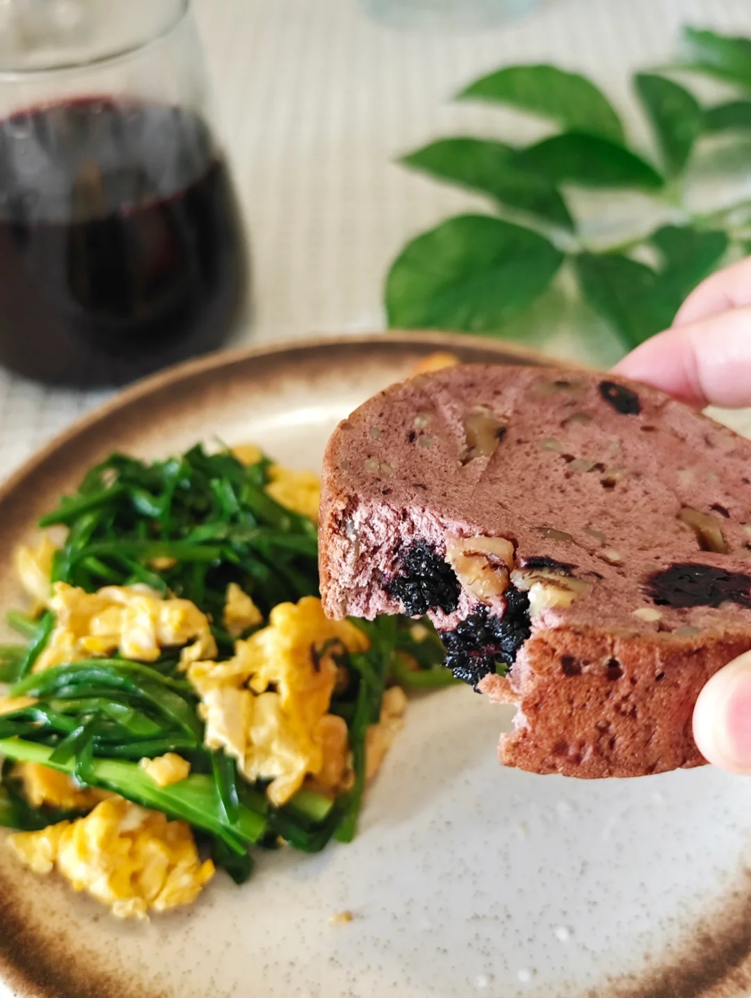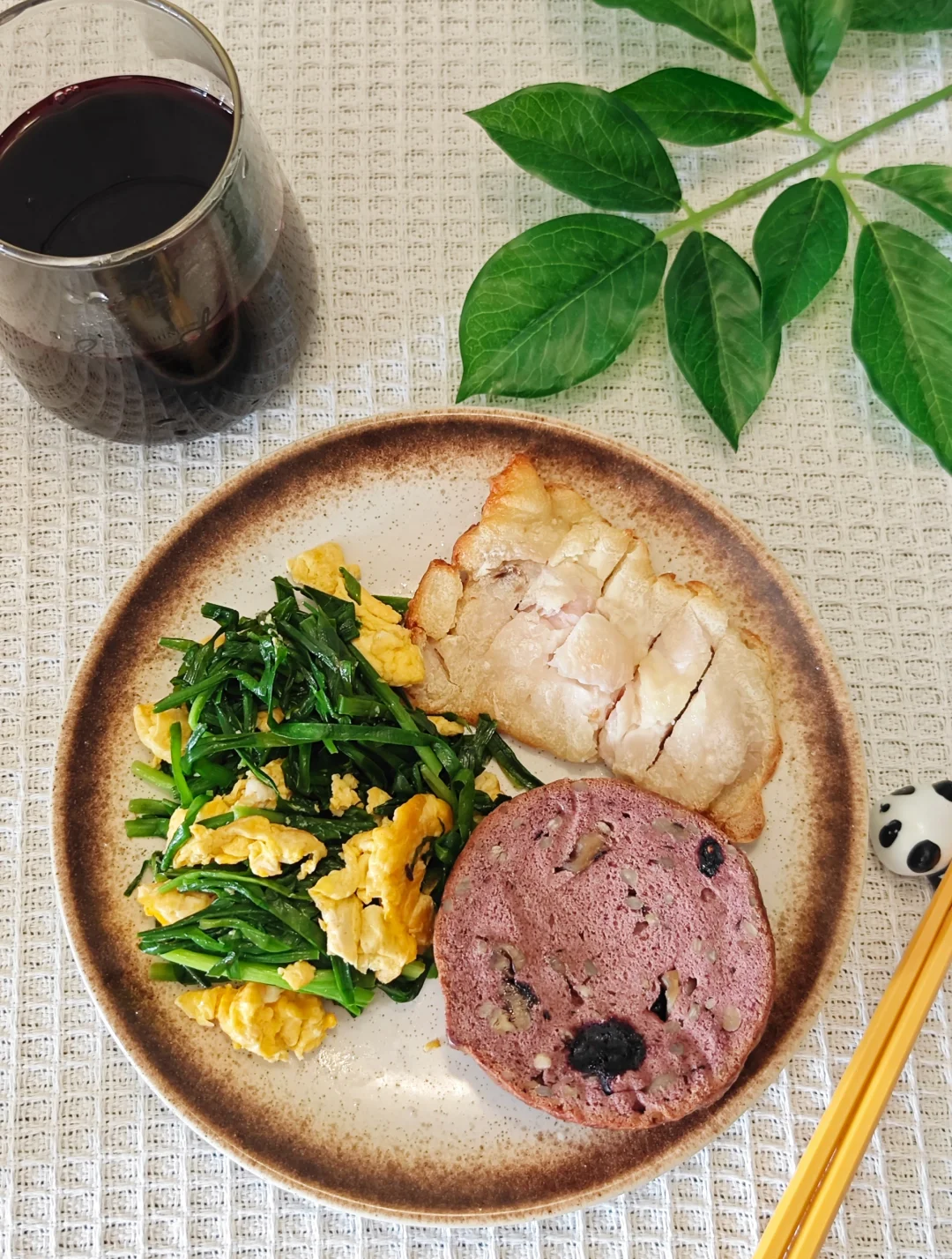桑葚车轮面包+香煎鸡胸肉+韭菜炒鸡蛋+桑葚汁