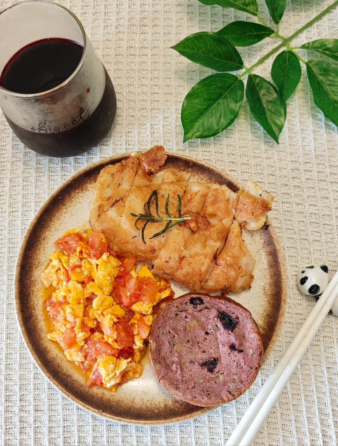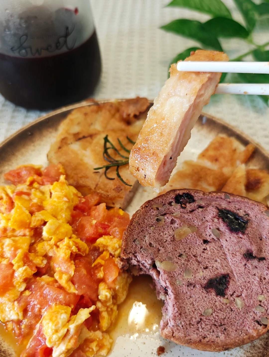 桑葚车轮面包+香煎鸡胸肉+西红柿炒鸡蛋+桑葚汁