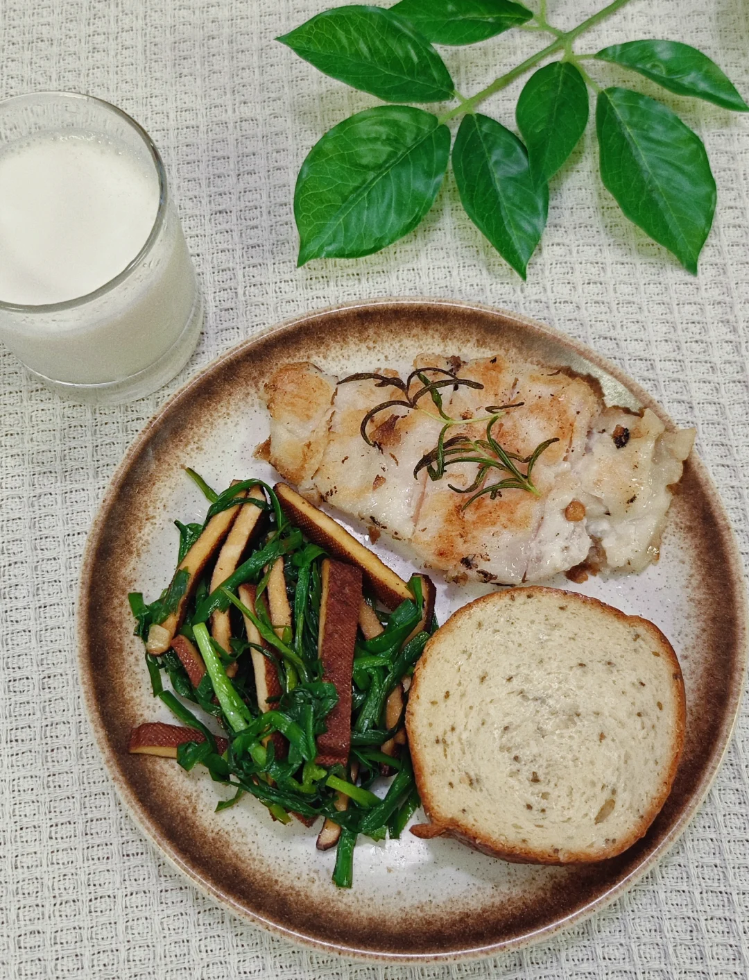 奇亚籽车轮面包+香煎鸡胸肉+韭菜炒香干+牛奶