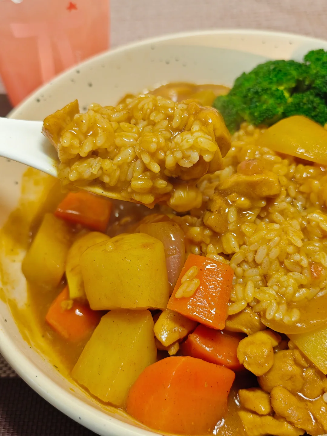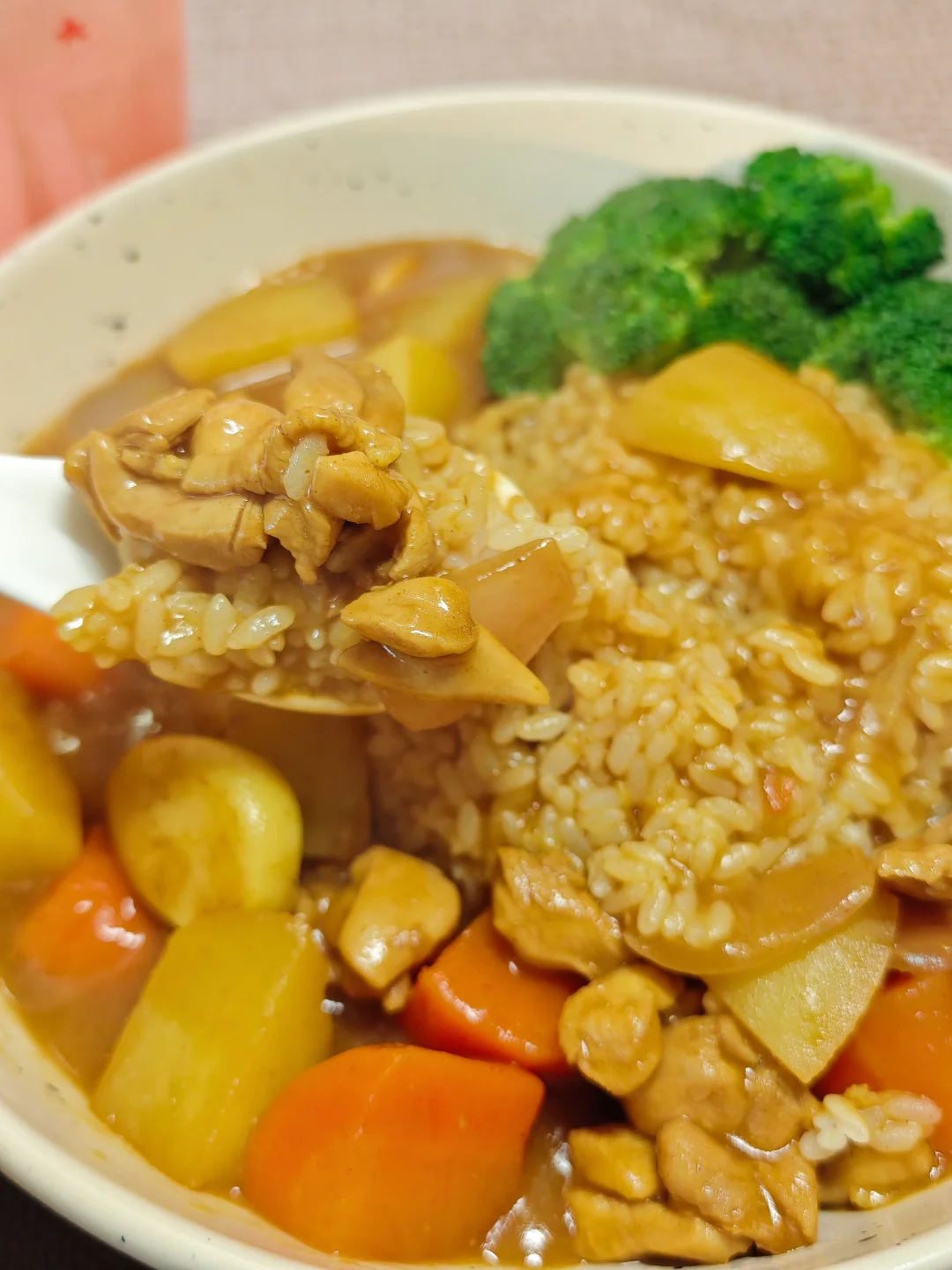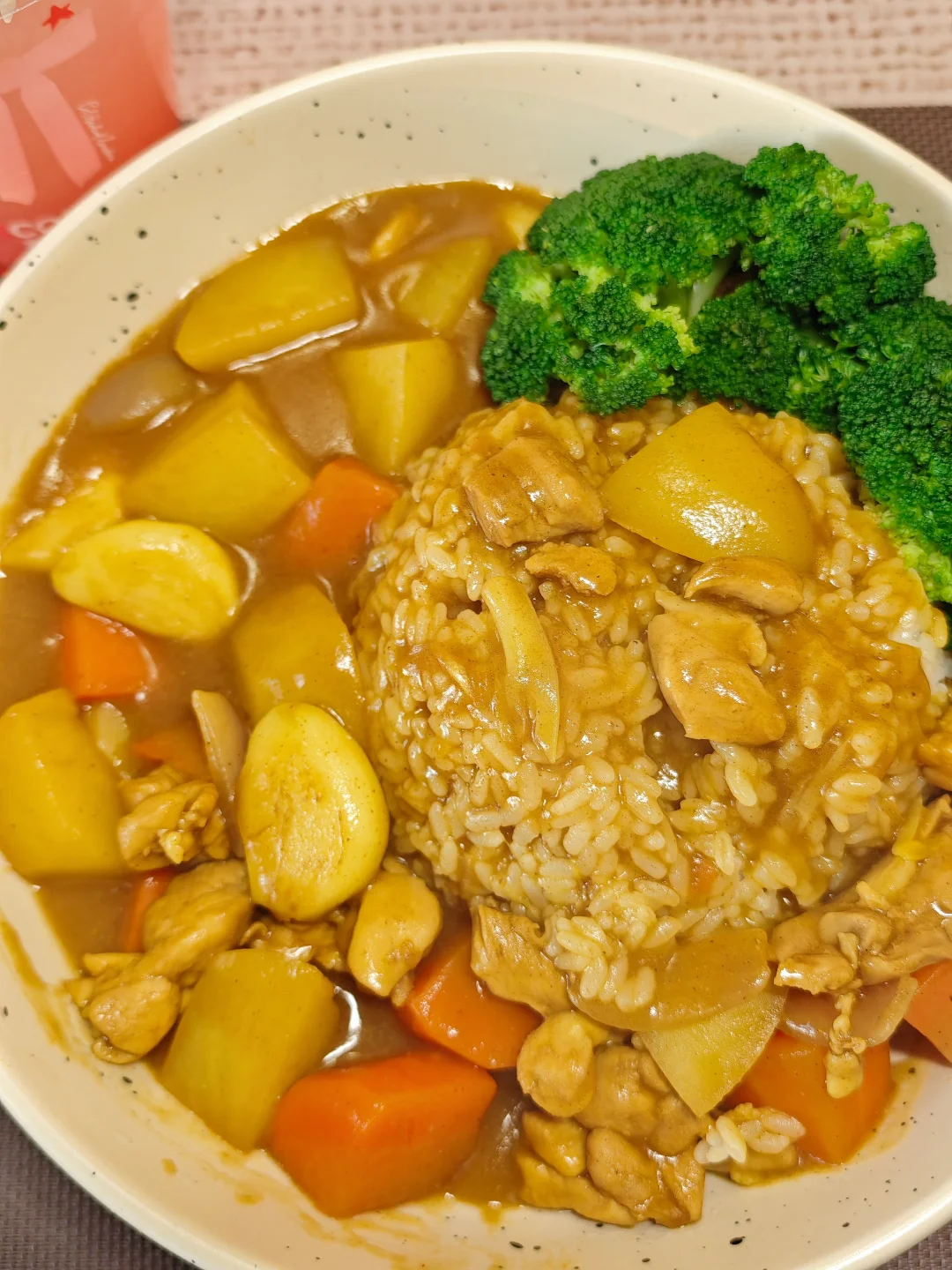 不是我说咖喱饭是真的香!在外面吃着不放心,自己煮肯定是又好吃又健康的,美美光盘行动!! 🌵准备食材 鸡肉块 土豆 洋葱 胡萝卜 西蓝花 🌵制作步骤 1⃣️锅里热油,加入蒜和洋葱片翻炒 2⃣️加入鸡肉块翻炒,用生抽,老抽调味 3⃣️加入开水,没过食材炖煮。加入一个咖喱块,炖煮到汤汁浓稠即可! ⚠️另外配点时蔬更健康!~