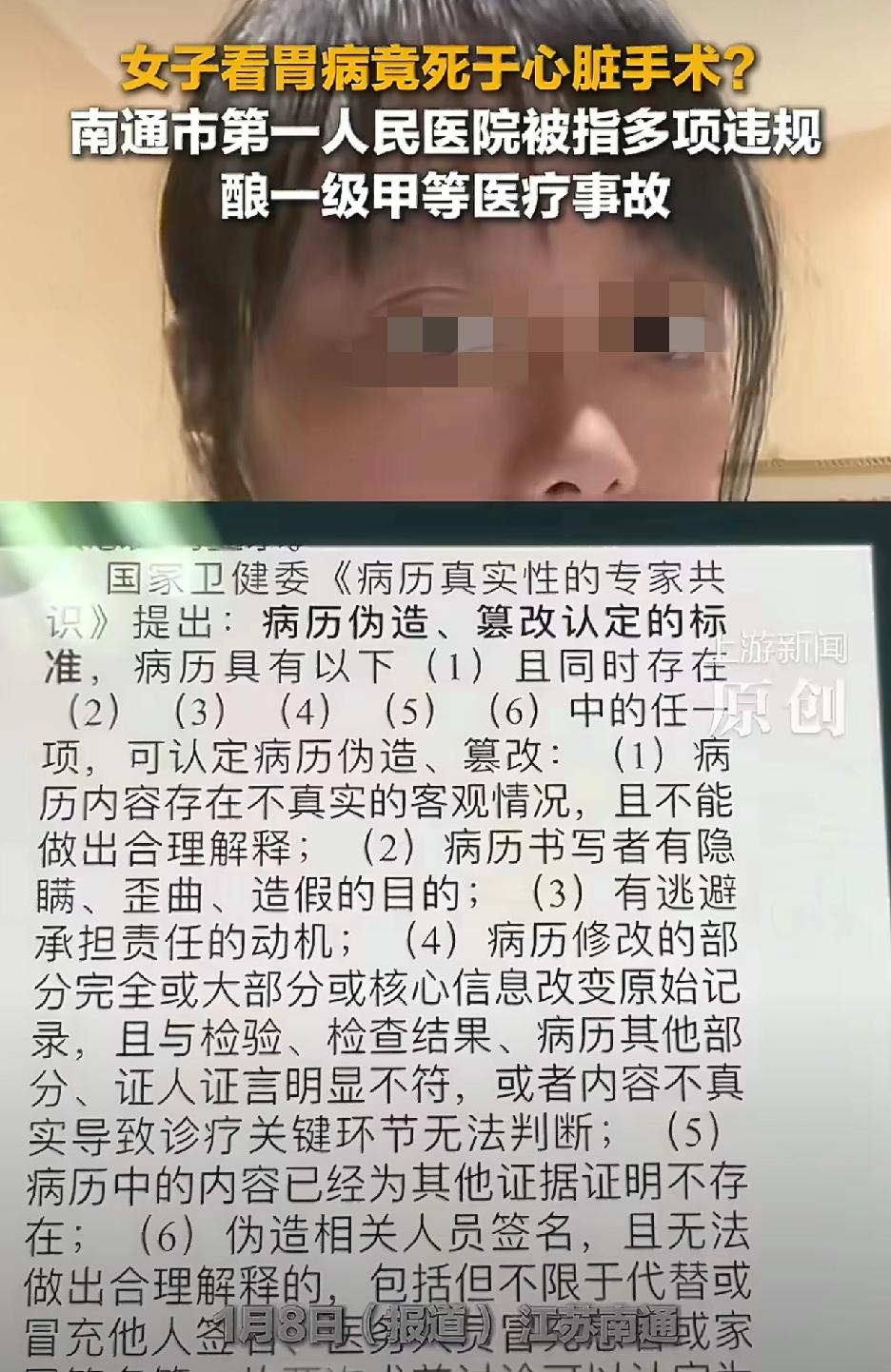 现在的医院都怎么了?这根本不能叫新闻了,叫骇闻才更贴切。 2025年4月,江苏省南通市的宋女士因胃病到南通市第一人民医院就诊,开始只是想单纯做个胃镜,最后却做了“心脏电生理检查及射频消融术”,也就是这一做,就再也没下手术床。 目前宋女士的女儿表明南通市第一人民医院依然未能给出明确说法,并且对鉴定中的细节她也同样存在质疑。该医疗事故也被列为了一级甲等事故。 我在想是不是这时候就有人说做手术风险就得自行承担,如果都这么闹就谁还做医生啊。我承认手术都有风险,家属应当有承担责任的觉悟,但是这绝对不是你医疗重大失误的借口,既然选择了医生这个行业,应当竭尽所能挽救生命,我们对尽力而为,当然不予追责,但是对枉顾生命,我们也不可能容忍。 结合近些日子的消息,我只想问现在的医院到底是咋了,不是仪器越来越先进,药物越来越多样化,为什么医疗事故却越来越多。而这件事不能又用一句简单的医疗事故来概括,应该公开手术细节,让所有人了解真相,才能还死者一个公道,宽慰家属的心!