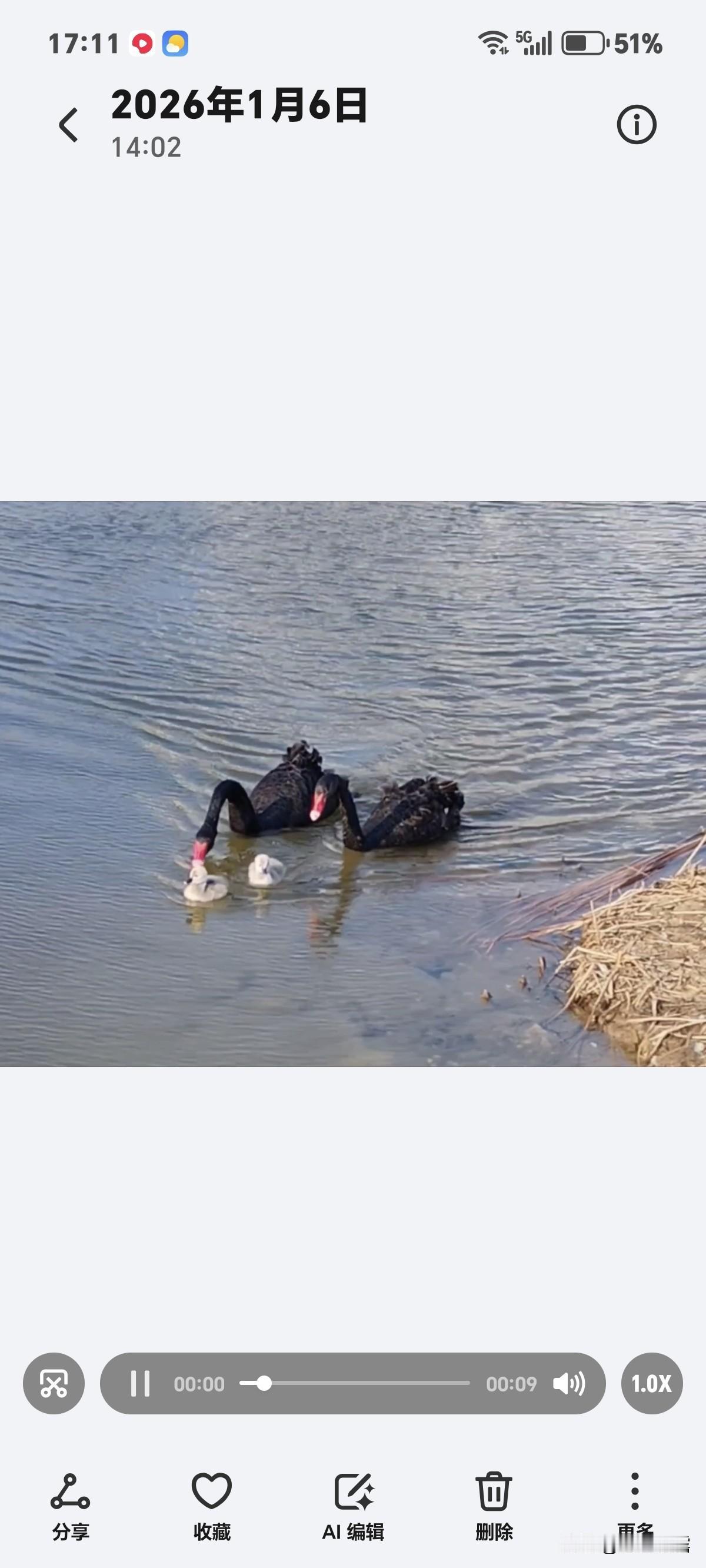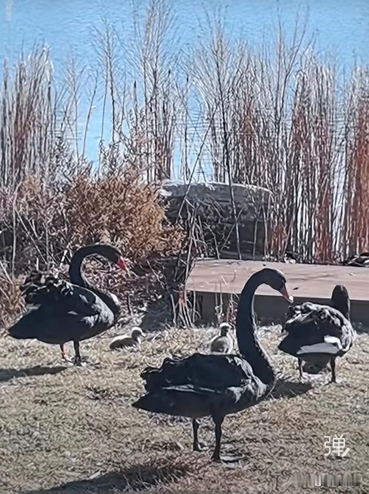 昨天挺暖和的,三九天难得有这么暖的天气,又去凌水湖看看黑天鹅一家啦,他们一家先是在水中嬉戏游玩,随后回到了它们的领地休息 ,天鹅夫妇领地意识很强,不允许其它天鹅到它们的领地住处,有来着奋起反抗,驱走它们,精心警惕的的保护着它们的宝宝,随手拍下了它们一家五口的画面,分享欣赏。
