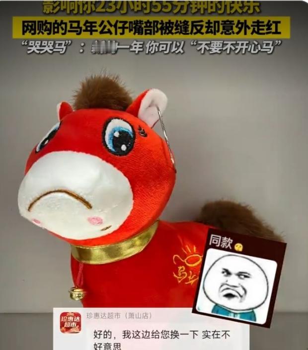 拆开快递的瞬间,浙江这位网友直接笑喷:明明下单的是嘴角上扬的喜庆马年公仔,到手却成了嘴角耷拉、一脸委屈的“哭哭马”,腮红还错挪到下巴,活脱脱一副被生活狠狠拿捏的模样。他哭笑不得地拍图发给商家,本想反馈换货,没想到客服也被这离谱又可爱的失误逗乐,当即承诺“错版您留着,立马补寄正版”。 网友闲来无事把这段奇遇分享到社交平台,谁料一夜之间彻底刷屏!评论区直接沦陷,大家纷纷喊话求同款:“这哪是次品?明明是隐藏款情绪搭子!”“耷拉的嘴角,简直是我周一上班的真实写照”“比那些强行正能量的吉祥物戳心多了,买它!” 有人给它取名“加班马”“甲方马”,说看着这只委屈巴巴的小马,瞬间觉得自己的疲惫有了安放之处,连吐槽都变得温柔起来。 原本要被工厂返工销毁的“残次品”,愣是凭一己之力逆袭成马年首个网红玩偶。商家看着全网汹涌的求购潮,果断调整生产线,把“缝反嘴巴”从失误变成专属设计,连夜加开多条产线三班倒赶工。最圈粉的是,面对暴涨的订单,商家没有趁机坐地起价,反复强调“加急赶工不涨价,守住亲民价,不让大家为喜欢多花钱”,这份清醒和真诚,让网友直呼“活该它爆火”! 其实这只哭哭马的走红,哪里是偶然?我们见多了完美无缺的喜庆吉祥物,却偏偏被这只带着“瑕疵”的小马戳中内心。当代人谁不是表面假装坚强,心里藏着数不清的小委屈?哭哭马从不用“加油”“要开心”绑架你,它只是安安静静耷拉着嘴角,告诉你“不完美也没关系,难过也值得被看见”。 如今这只小马不仅火遍国内,还成了年轻人之间的社交硬通货,送闺蜜是懂她的贴心,放工位是解压的神器。一场小小的生产失误,竟酿成了治愈无数人的温暖故事,这大概就是生活最可爱的馈赠——偶尔的不完美,反而藏着最动人的惊喜。生肖马公仔 马年公仔