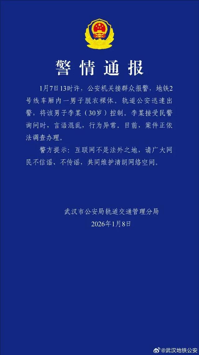 1月9日,记者从湖北省武汉市公安局轨道交通管理分局获悉,1月7日13时许,公安机关接群众报警称,武汉地铁2号线车厢内有一男子脱衣裸体。现该男子已被控制,案件正依法办理。