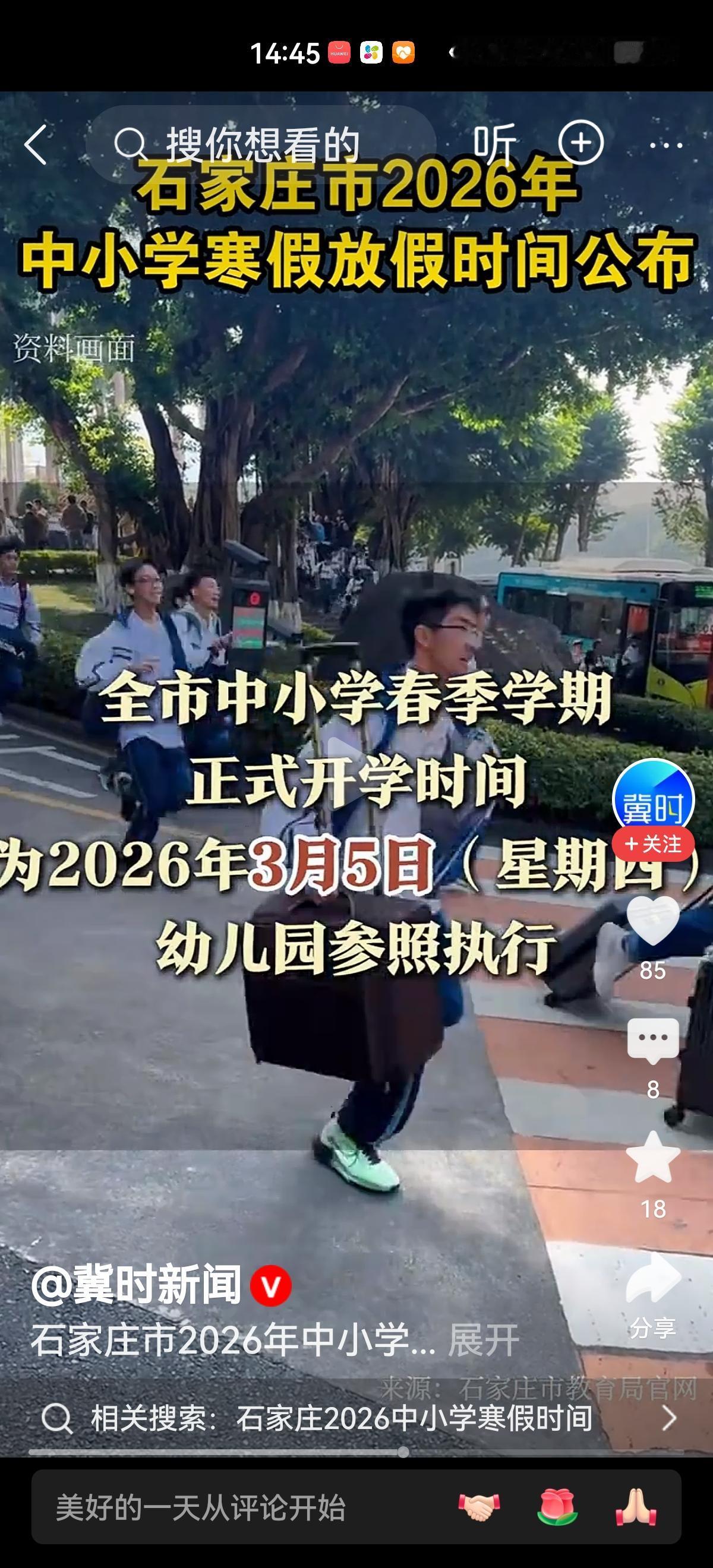 据冀时新闻消息,石家庄市2026年中小学寒假放假时间公布了!别着急,各市陆续也要