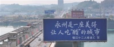 【一句广告语 温暖两座城】近日,一场因“苏超”“湘超”比赛而起的城市互动热潮,在湖南永州悄然升温。继苏州、南京等多地网友在永州宋家洲大桥桥头打出“这里是永州,我们是冠军”的助威广告后,1月7日中午,一块署名“镇江十二人球迷汇”的新广告牌亮相桥头,上面写着:“永州是一座美得让人吃‘醋’的城市。”这句巧妙融入镇江城市名片的标语,迅速在网络“出圈”,成为这场跨地域暖心互动中的一道别致风景。