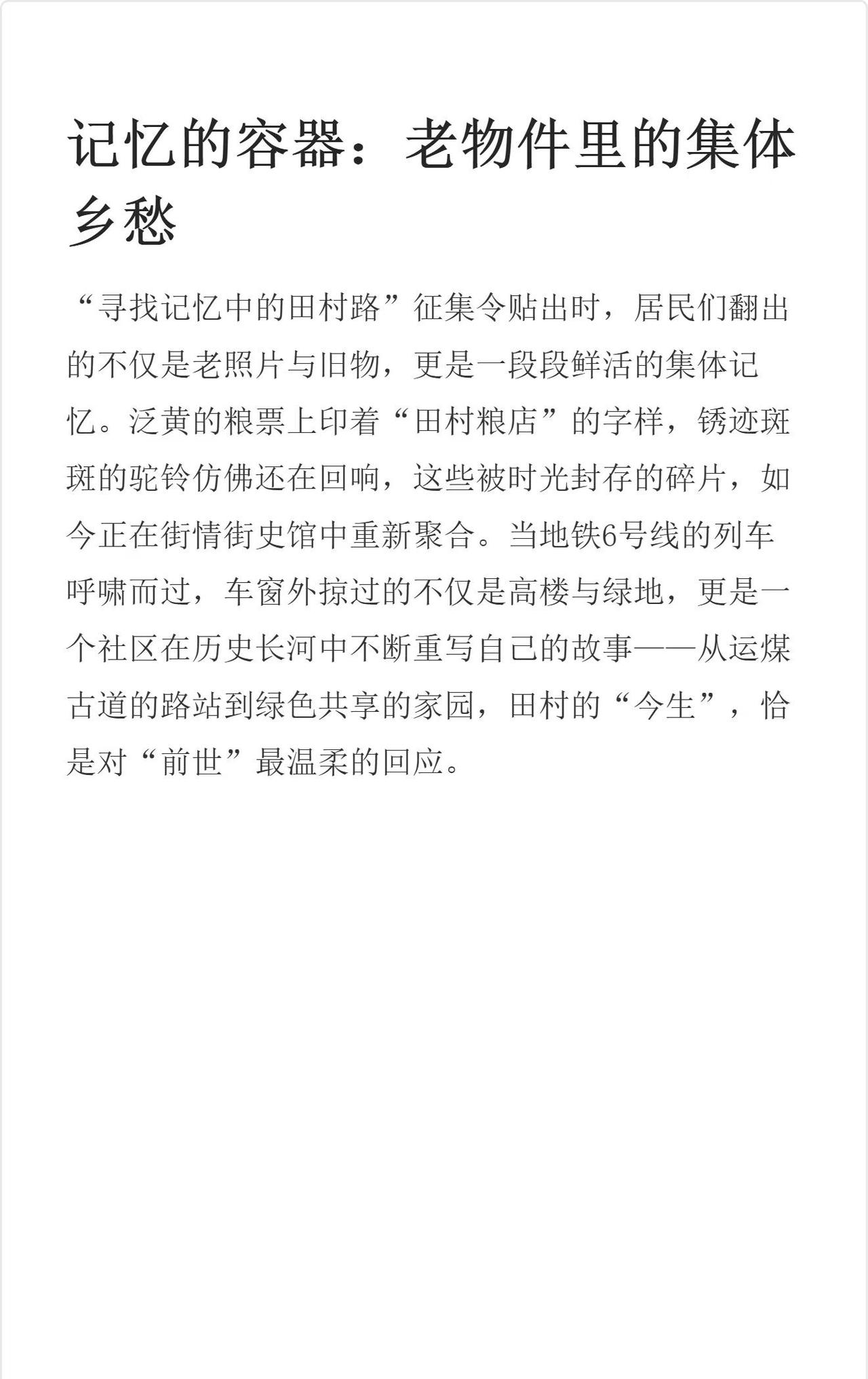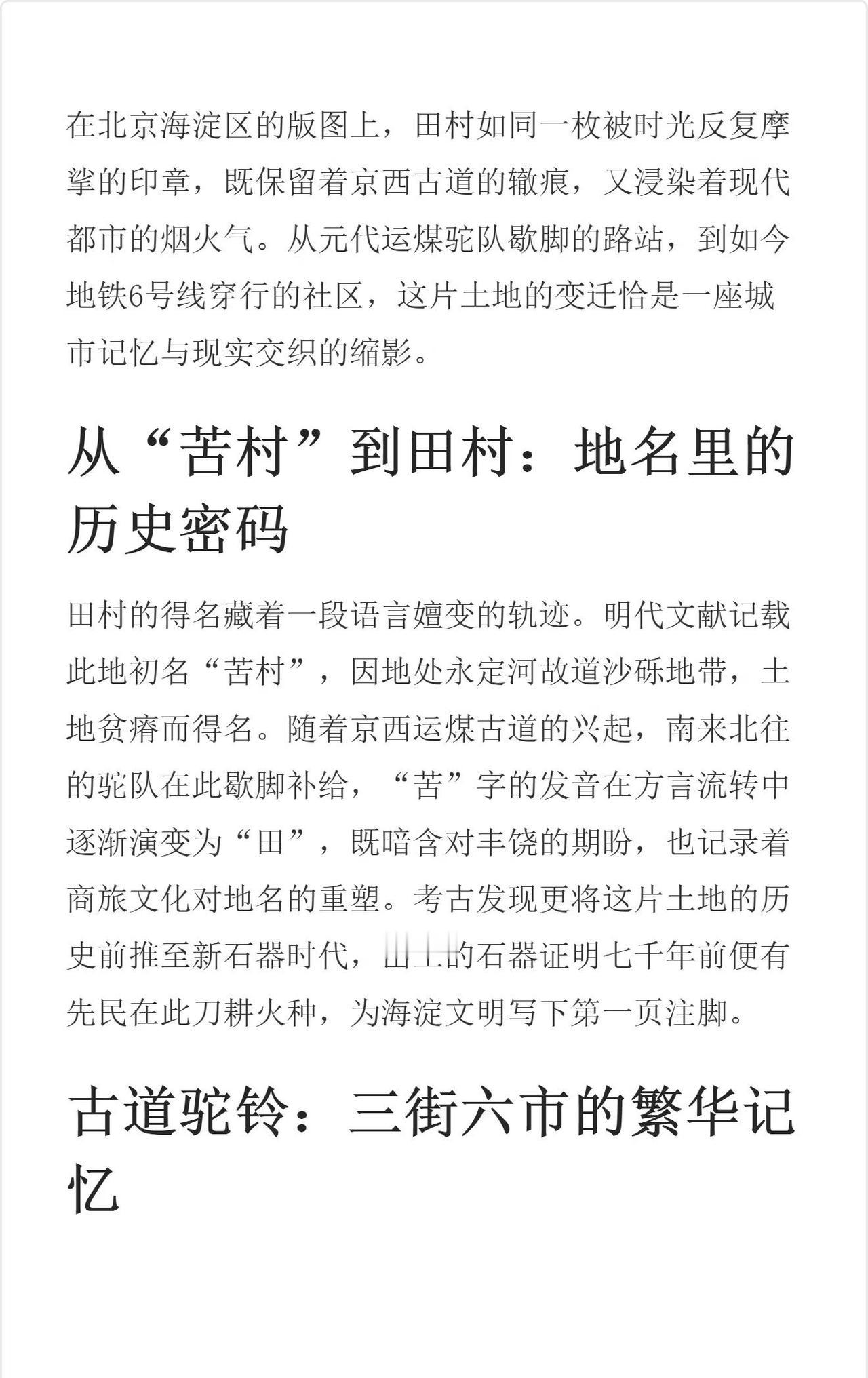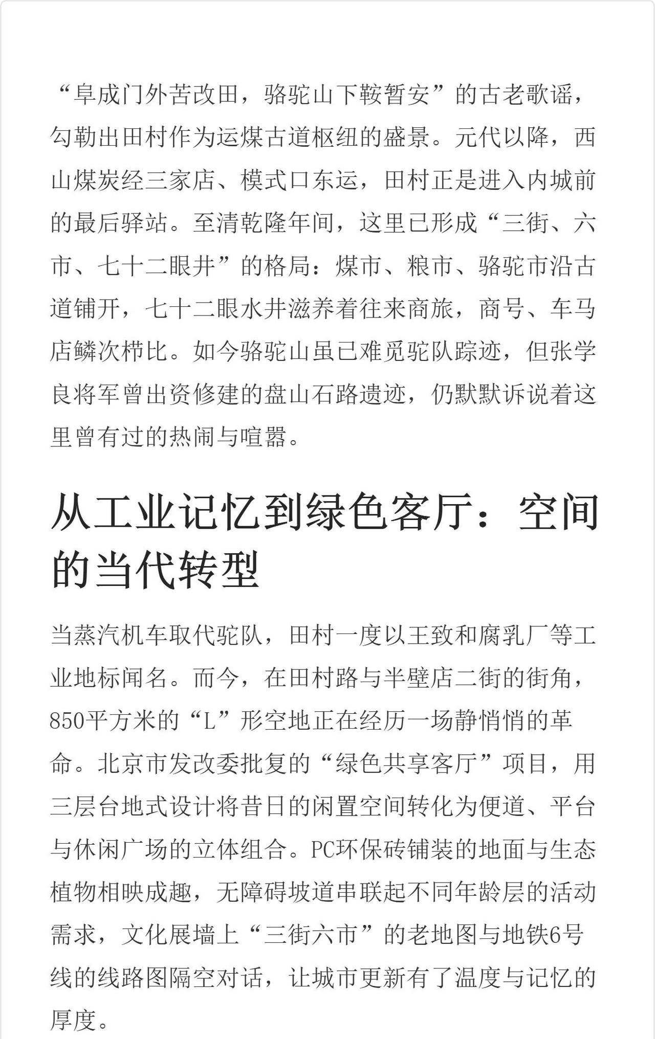 田村:从驼铃到地铁的记忆 七百年前驼铃响彻的运煤古道,如今已被地铁6号线的呼啸覆盖。当“苦村”的贫瘠记忆在方言中嬗变为“田村”的丰饶期盼,这片土地正用“绿色共享客厅”的立体设计,让工业锈带与古道辙痕在城市更新中达成和解。老地图与地铁线路图的隔空对话,藏着北京社区如何在时光折叠中保持温度的秘密。 田村 时光的记忆 纯朴的年代 我与土地的故事 历史的味道 海淀田村 城市更新 历史记忆 社区变迁