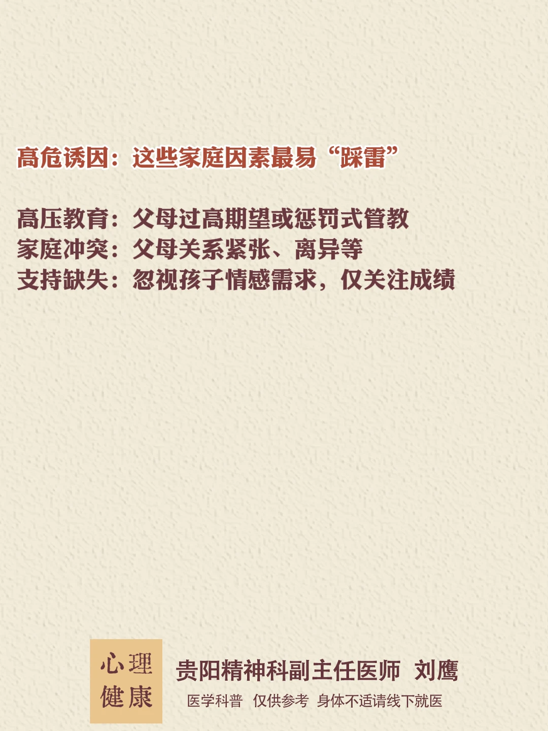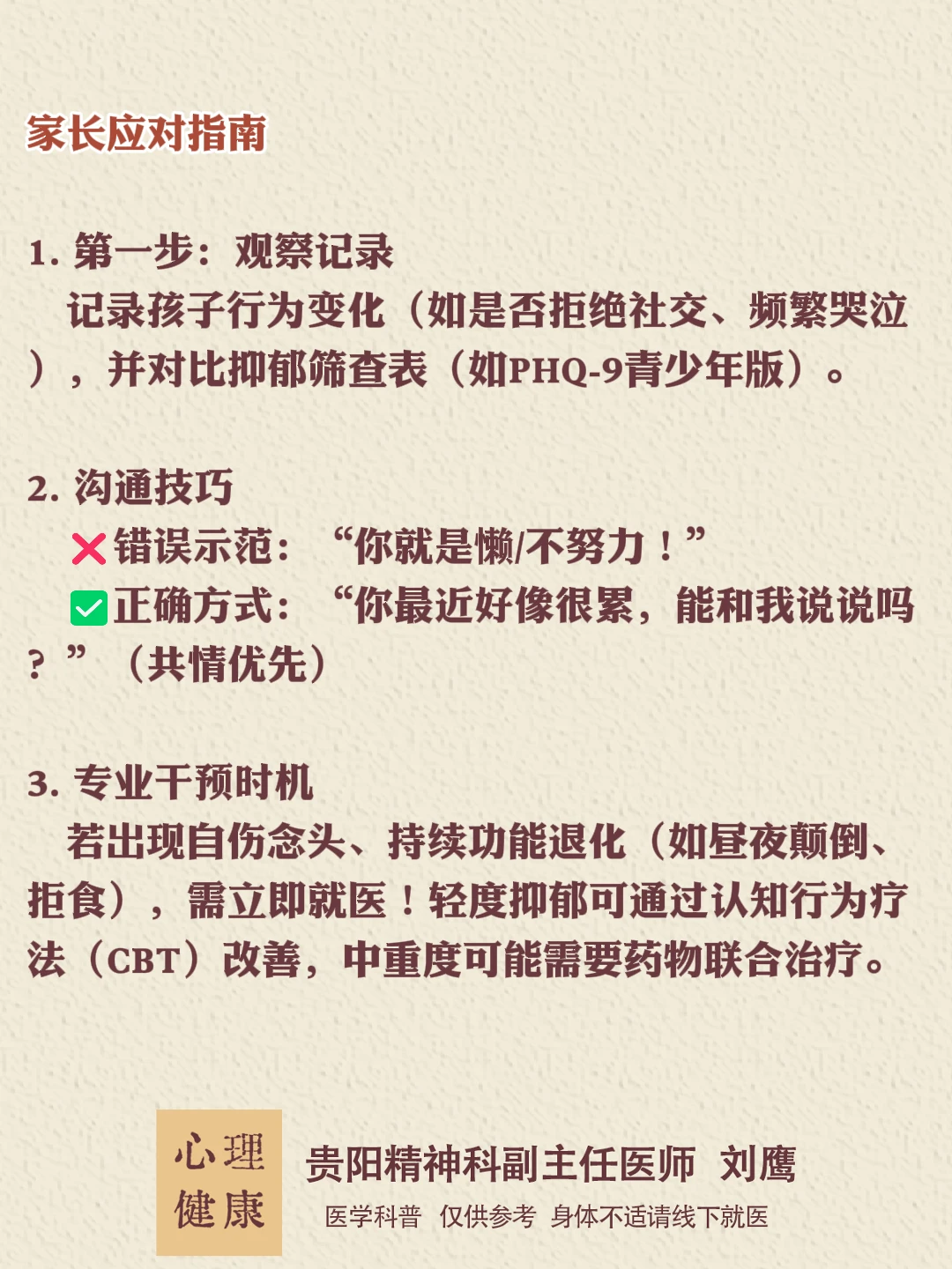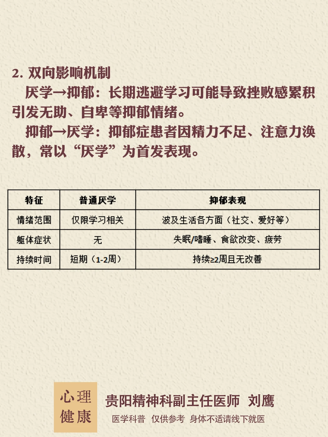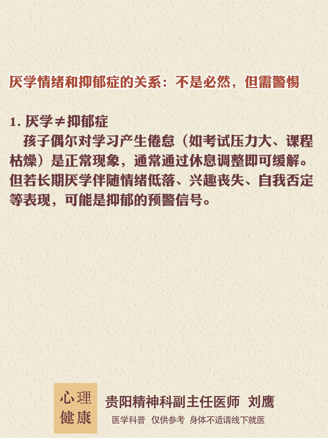 贵州的朋友们,大家好,我是贵阳精神心理科医生刘鹰。 厌学像心理的“咳嗽”,可能是短暂不适,也可能是重病前兆。早识别、早干预,才能避免情绪雪崩!