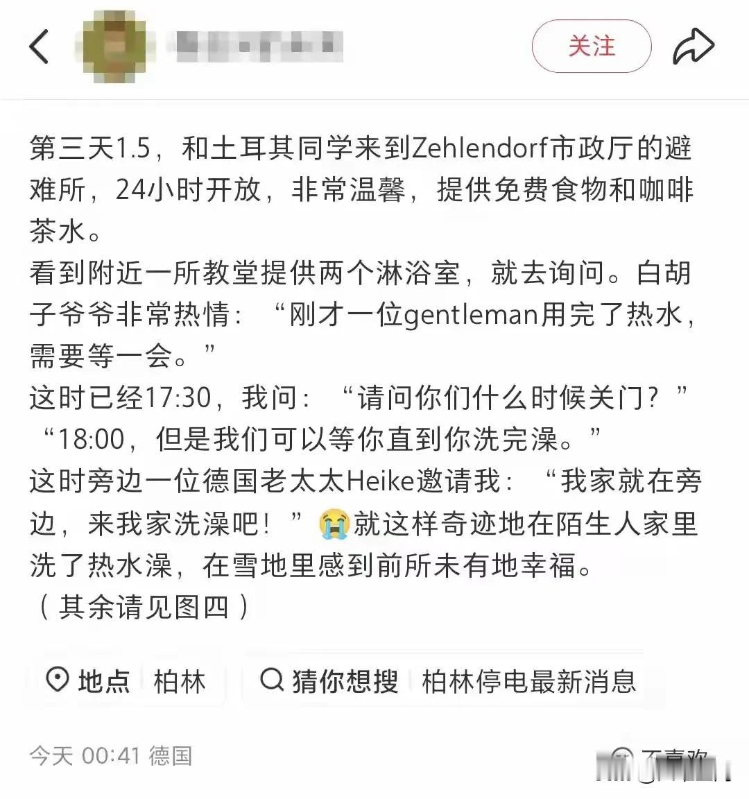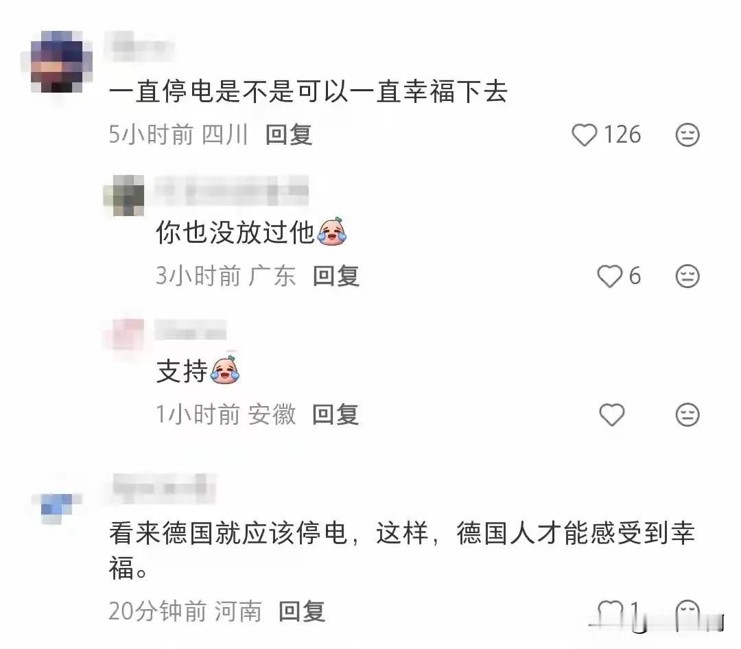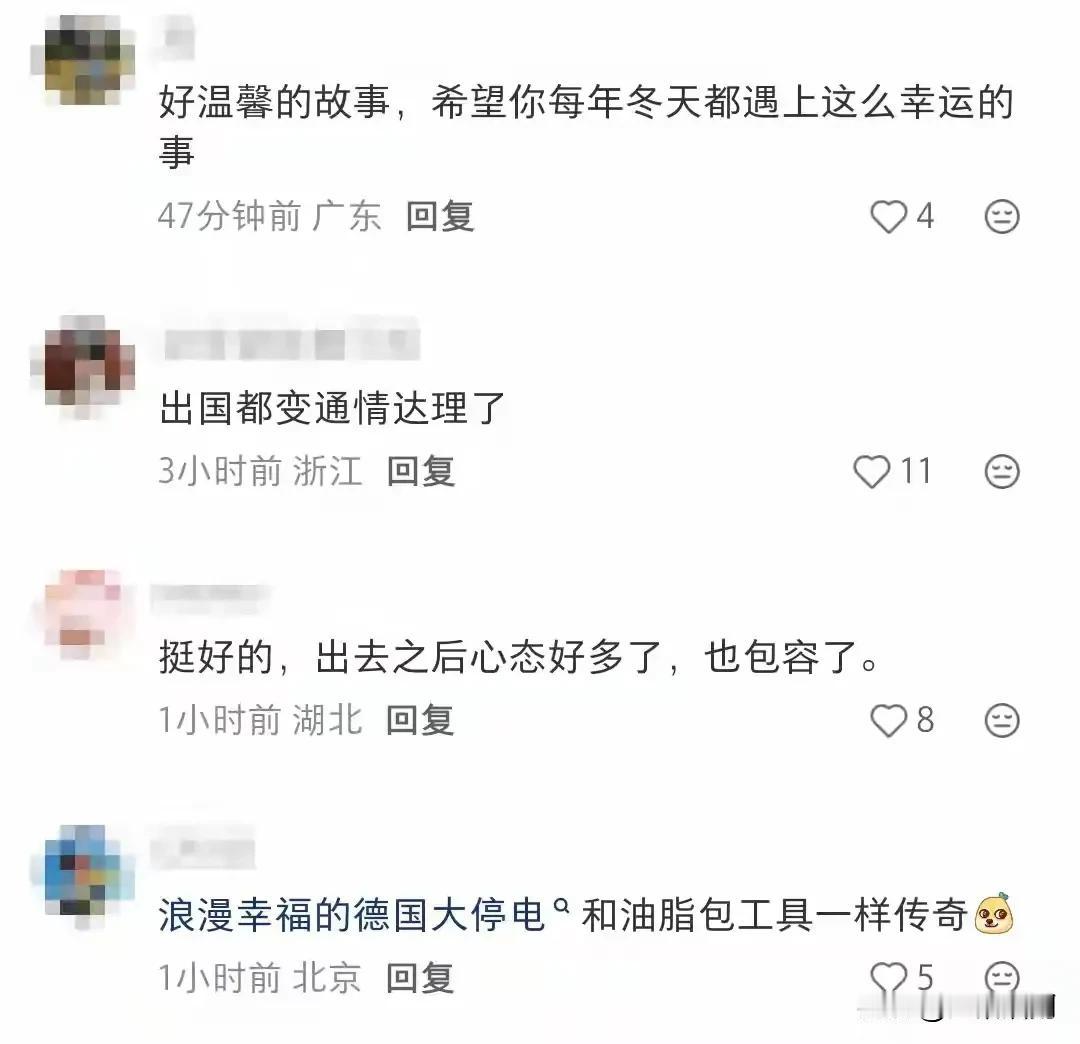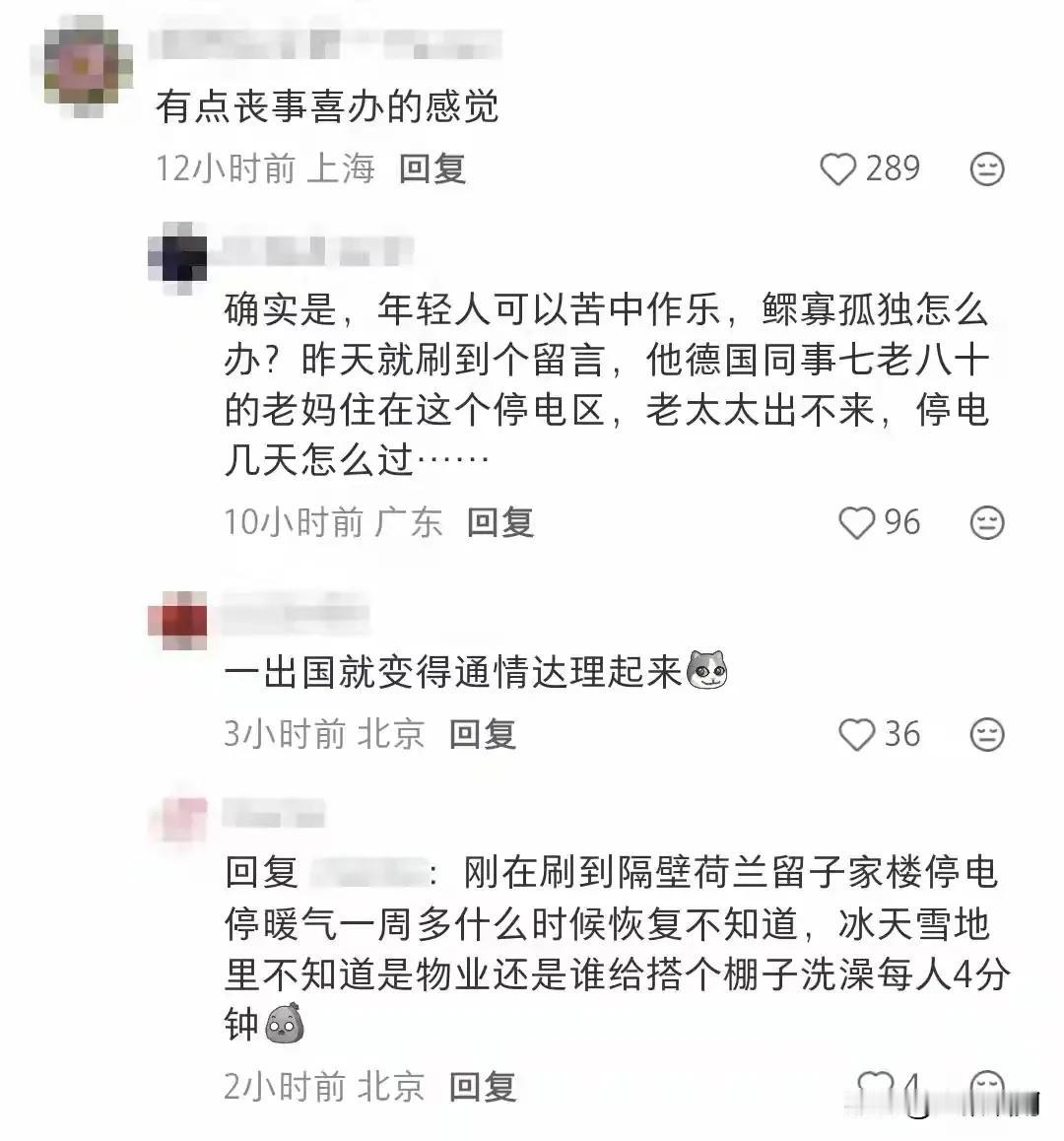 有些殖人一出国瞬间变得非常通情达理,在柏林遇到停电3天,结果不仅没有抱怨,反而觉得很幸福,很幸运,真的服了,要是在国内,就算不停电,它们也整天抱怨电贵,电表走得快,有时候可能维修需要,停个几小时,它们可能就要在网上抱怨没有效率,甚至可能不停地打电话投诉,真的有时候我们不要搞得太好了,因为吃太饱了,保护太好了,反而容易出巨婴,在国内各种埋怨,出国却通情达理!