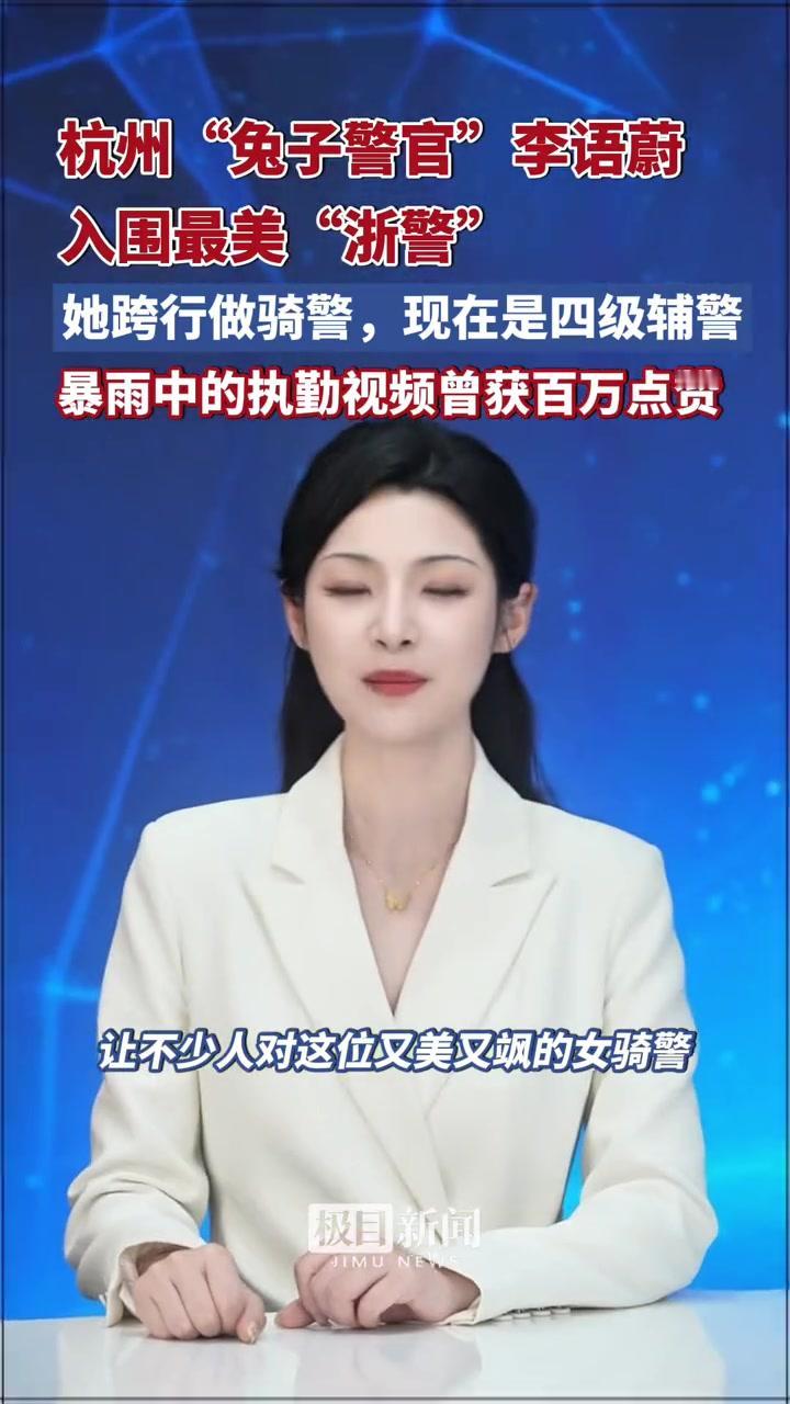 最美“浙警”: “兔子警官”当选 在第六个中国人民警察节来临之际,2025最美“浙警”名单揭晓,“兔子警官”李语蔚光荣当选。李语蔚是杭州市公安局交警支队景区大队灵隐中队的铁骑队员,她凭借学前教育专业背景,将哄孩子式的柔性执法理念融入交通管理,以甜美笑容和专业指挥成为西湖景区一道独特风景线。2024年,她因游客拍摄的执勤视频走红网络,被亲切称为“兔子警官”。 从警四年来,李语蔚累计参与紧急救助30余次,收获5面锦旗和12封表扬信。她不仅在岗位上兢兢业业,还积极参与交通安全宣传,录制《开学第一课》等课程,让安全知识深入人心。面对网络质疑,她以勤恳工作回应,用实力证明自己。此次当选最美“浙警”,既是对她个人工作的肯定,也是对浙江公安柔性执法理念的认可。