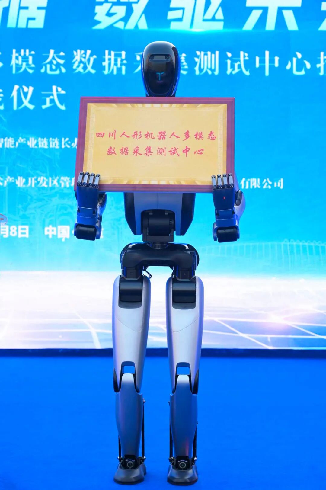 在启动仪式环节,一台WalkerS2稳步走上舞台,手举“四川人形机器人多模态数据采集测试中心”牌匾,宣告中心全面启用。