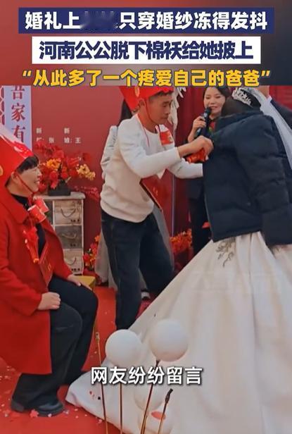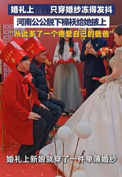 河南周口那场婚礼,寒风刺骨,新娘穿着薄婚纱站在院子里,嘴唇发紫,手抖得连敬茶的杯子都快拿不住。 公公站在一旁,看了她一眼,什么话也没说,直接脱下自己身上那件穿了多年的旧棉袄,披到她肩上,还伸手帮她把领口拉紧,挡住所有往里钻的冷风。 那一刻,新娘整个人僵住。她低头看了看忽然暖过来的衣服,又抬头看向这个刚刚成为公公的男人,眼泪毫无征兆地涌出来。她哽咽着,只喊出一个字:“爸。” 不是委屈,是被毫无防备的疼爱击中了。很多人结婚,婆家第一眼看的是彩礼多少、陪嫁多少,而这个公公,第一眼看到的是儿媳冻成什么样子。 婚纱美则美矣,风一吹就成了最薄的纸。北方冬天的婚礼,多少新娘咬牙硬扛,笑得勉强,肩膀却在偷偷发颤。偏偏这个公公没讲排场,没说场面话,只是用最笨拙也最直接的方式,把自己身上的温度给了她。 那一件棉袄,比任何金句都诚实。它带着老人的体温和烟火气,瞬间把陌生变成了骨肉至亲。新娘哭的不是冷,是忽然发现,原来嫁过来不是进了别人家,而是多了一个会心疼她的父亲。 网友刷屏那句“从此多了一个真心疼她的爸爸”,其实说出了太多女人的隐秘渴望。嫁出去的女儿,最怕的不是穷,是冷。不是经济上的穷,是人心的冷。婆家一挑剔、一算计,那种寒意比冬风还刺骨。可反过来,一件外套、一声“爸”,就能把后半生的安全感直接拉满。 这个细节戳中的,是当代婚姻里最普遍也最隐痛的反差:仪式再盛大,烟花再璀璨,如果没有那一点点真实的温度,婚礼就只是个华丽的空壳。 而公公什么都没做对,只是做了唯一该做的事——把人当人,把媳妇当闺女。他没想过要上热搜,没想过要当模范公公,只是下意识地觉得,这孩子冷了,得暖着。 很多时候,婚姻最好的开端,不是钻戒多贵、车队多长,而是寒风里忽然多出来的一件外套,和那一声迟来的、却无比真实的“爸”。 那一瞬,冷风还在刮,可新娘的眼泪,已经是热的。