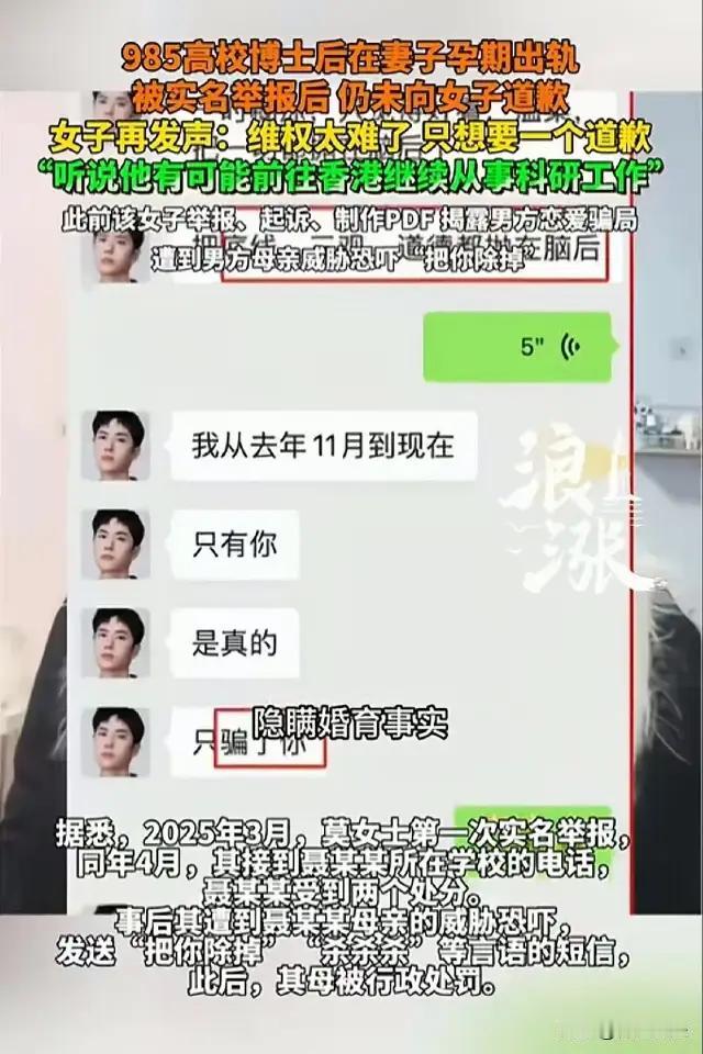 **她想查“出轨”,却查出了自己的“第三者”身份。** 北京女孩小林,和男友恋爱两年,感情稳定,已经开始看婚房、商量彩礼。 可最近,男友总神神秘秘,手机从不离身,微信一响就躲进阳台,还备注一个叫“王总”的人:“今天别发消息。” 女人的第六感瞬间拉响警报:他是不是脚踏两条船? 一天,她假意要给男友买鞋,借来手机操作时,手一滑点进了微信对话框—— 那个“王总”的聊天记录,像一场噩梦般铺开: > “宝宝今天会爬了,录了视频给你。” > “奶粉快没了,记得寄钱回来。” > “妈说你要是敢离婚,就去你公司闹!” 往下翻,更让她窒息的是:**对方发来的婴儿视频里,男人穿着她熟悉的那件灰色卫衣,抱着孩子亲吻——正是她的“未婚夫”。** 她脑子“嗡”的一声炸开: **那个她以为是“老板”的人,是他的妻子; 那个她以为在谈婚论嫁的男人,早已结婚生子,隐瞒一切,骗了她整整两年!** 她冲出去质问,男友竟冷笑:“我又没逼你信我,你自己看不出?现在装什么受害者?” 那一刻,她不是愤怒,是彻底崩塌。 她省吃俭用为未来攒钱,认真规划婚礼流程,甚至拒绝了更好的追求者…… 而他在另一头,扮演着丈夫、父亲、孝子,把她当情绪出口、寂寞慰藉、免费女友。 这不是爱情,是精心设计的情感诈骗。 更讽刺的是,法律拿他没办法——没有领证,不算重婚;没拿她一分钱,不构成诈骗。 他游走在道德缝隙里,肆无忌惮地收割真心。 事件曝光后,网友怒骂:“建议列入婚恋黑名单公示!” 也有人痛心:“多少女孩还在替别人的家庭幸福买单?” 请婚前务必查婚姻状态 别让真心输给谎言 真正的渣,是笑着把你推进深渊 我们呼吁:建立**婚恋诚信档案系统**,让隐瞒婚史者无所遁形。 爱情不该是一场信息不对等。情感出轨 情感大起底