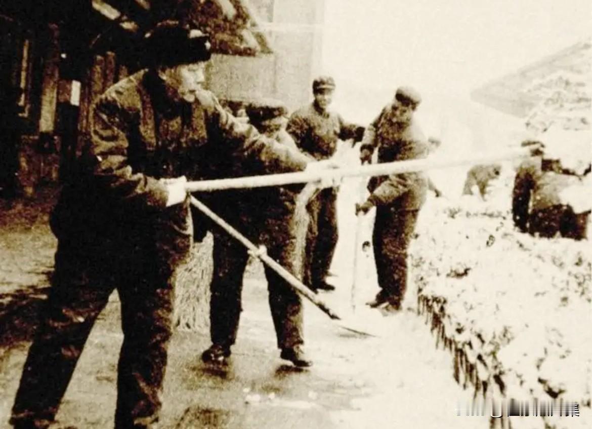 1981年,时任饶守坤将军(济南军区司令员,左一)与干部战士们清理积雪的照片。当时济南确实遭遇大雪,根据《济南市志》《济南铁路志》等权威史料,积雪深度达15厘米,造成交通堵塞。当时济南军区机关干部、驻济部队官兵约3000人参与清扫积雪。