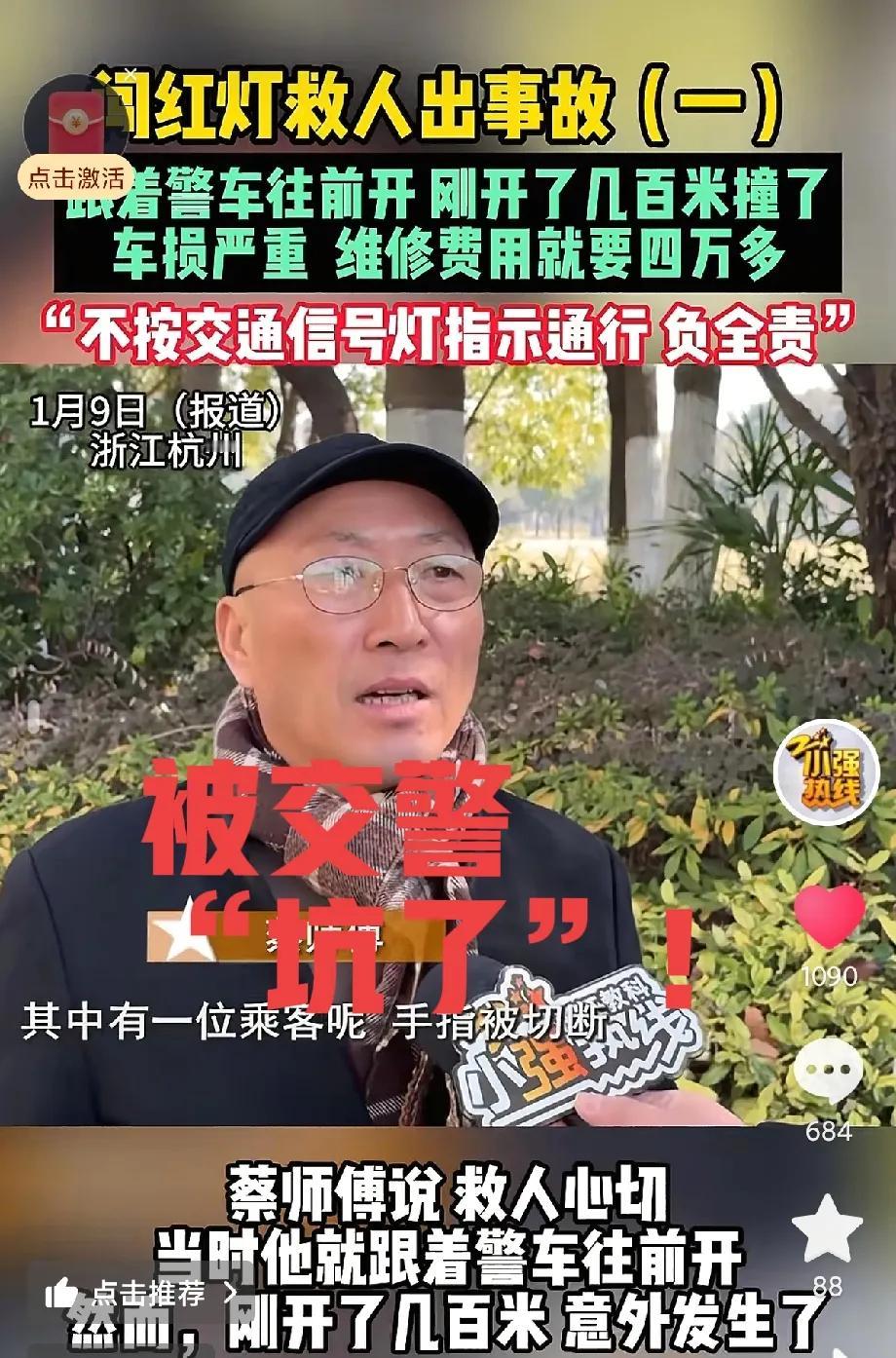 委屈!浙江,乘客手指被切断,司机被交警示意跟着他开车走,万万没想到,交警闯红灯,结果跟车司机被撞了,事后结果更让人心凉,竟然判司机蔡师傅全责,维修费用就要4万多。 乘客的手指被切断了,交警查看了一下,车里确实有伤者和断指,接着就和上级打电话汇报,征得同意后,于是转身就骑上了摩托车,要为他们开路,还点头示意司机跟上他。 交警开着警报灯,在前面开路,速度也不慢,然后就直接闯了红灯,蔡师傅跟在后面,也跟着闯了。 结果正在这时,一辆黑车开了上来,直接把蔡师傅的白车撞出去了。 事后在认定责任的时候,蔡师傅等了一个多月,最终竟然判他全责。 他面对这种的结果真的是无法理解,困惑,迷茫,无助,我是在做好事儿,在助人为乐呀! 后来,蔡师傅于是就开始提起复核,交警大队也给复核结论,会重新调查认证,结果最终的结果还是蔡师傅是全责。 有的网友感慨, 做好事的成本很高啊,又上课一课 也有的网友说,怎么听着有一种"领导跟小明说你就按着我说的做,然后出现问题了,领导说小明不会思考,后果自己承担"的感觉!后面小明应该就不会信领导的话了! 还有的网友认为交警大队判定责任没有问题,因为无论是警车、消防车、救护车在执行任务情况可以闯红灯和不安路线行驶的前提是:在安全情况下通行和不能威胁其他参与者的生命安全!判你全责是符合交通法规的!做好事不能威胁其他交通参与者的生命安全! 交警过红灯路口应当引导后车先过,然后在继续前行,即便出事了也要积极善后,给驾驶员相当的慰问,做事不能让好人寒心啊。 可以特事特办,车可以全责,但不扣分,还得出证明,保险公司不加险费,见义勇为可申请奖励,因为总不能判另外的车有责吧,不然保险谁来,只有有责一方的保险出。 更何况司机还是网约车,出事确实更麻烦,主要这是人家吃饭的工具! 所以大家也可以长一个心眼,遇见红灯,该停就要停。