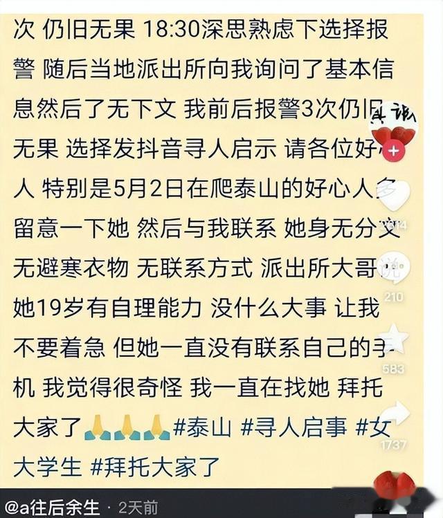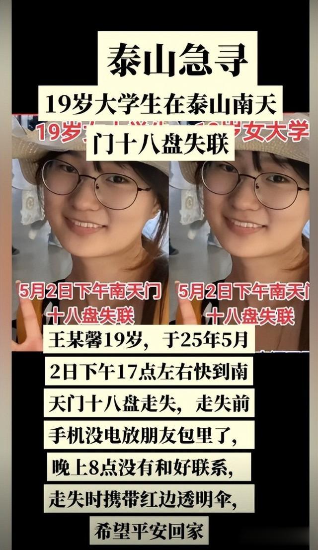 根据当事人发布在网络上的寻人启事可以了解到,5月2日的时候,一名19岁的女大学生王某在和朋友一同登泰山的时候失踪。