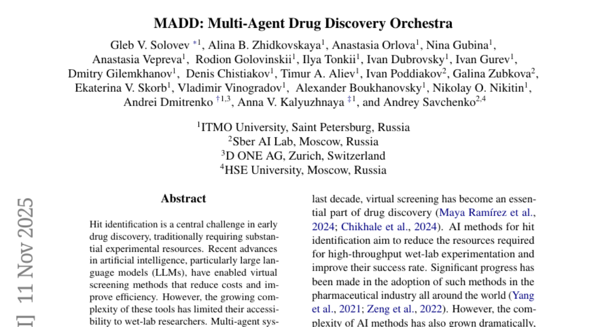 这项由俄罗斯圣彼得堡ITMO大学的Gleb V. Solovev领衔的国际研究团队发表于2025年11月的人工智能领域重要学术成果,论文编号为arXiv:2511.08217v1,为药物发现领域带来了一场真正的革命。研究团队汇集了来自ITMO大学、Sber AI Lab、D ONE AG和HSE大学的顶尖科学家,他们共同开发了一个名为MADD(Multi-Agent Drug Discovery Orchestra,多智能体药物发现管弦乐团)的创新系统。