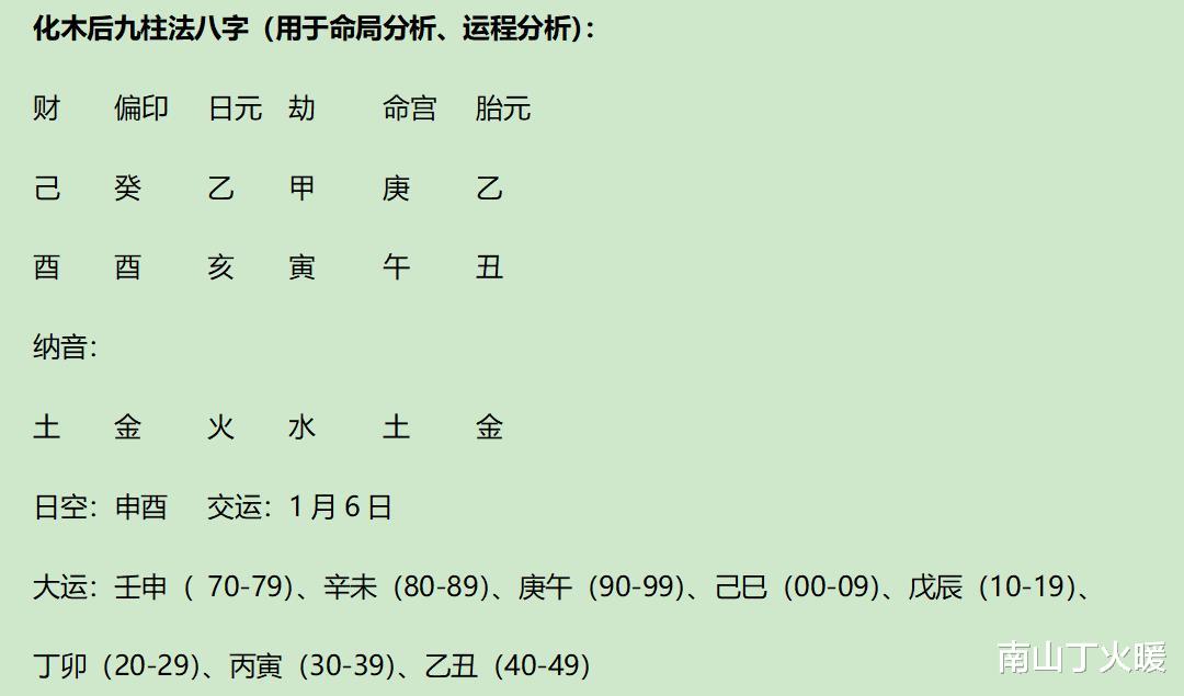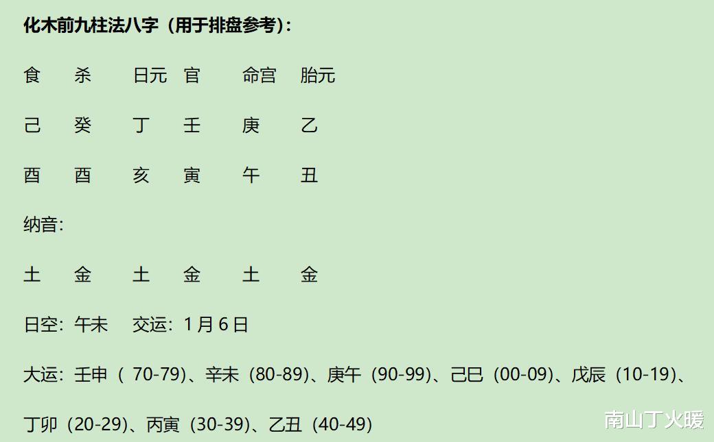 此年,丁食、丙伤生己偏财,己偏财制癸偏印;大运卯合日支亥,流年午合时支寅,小限酉合丑。
