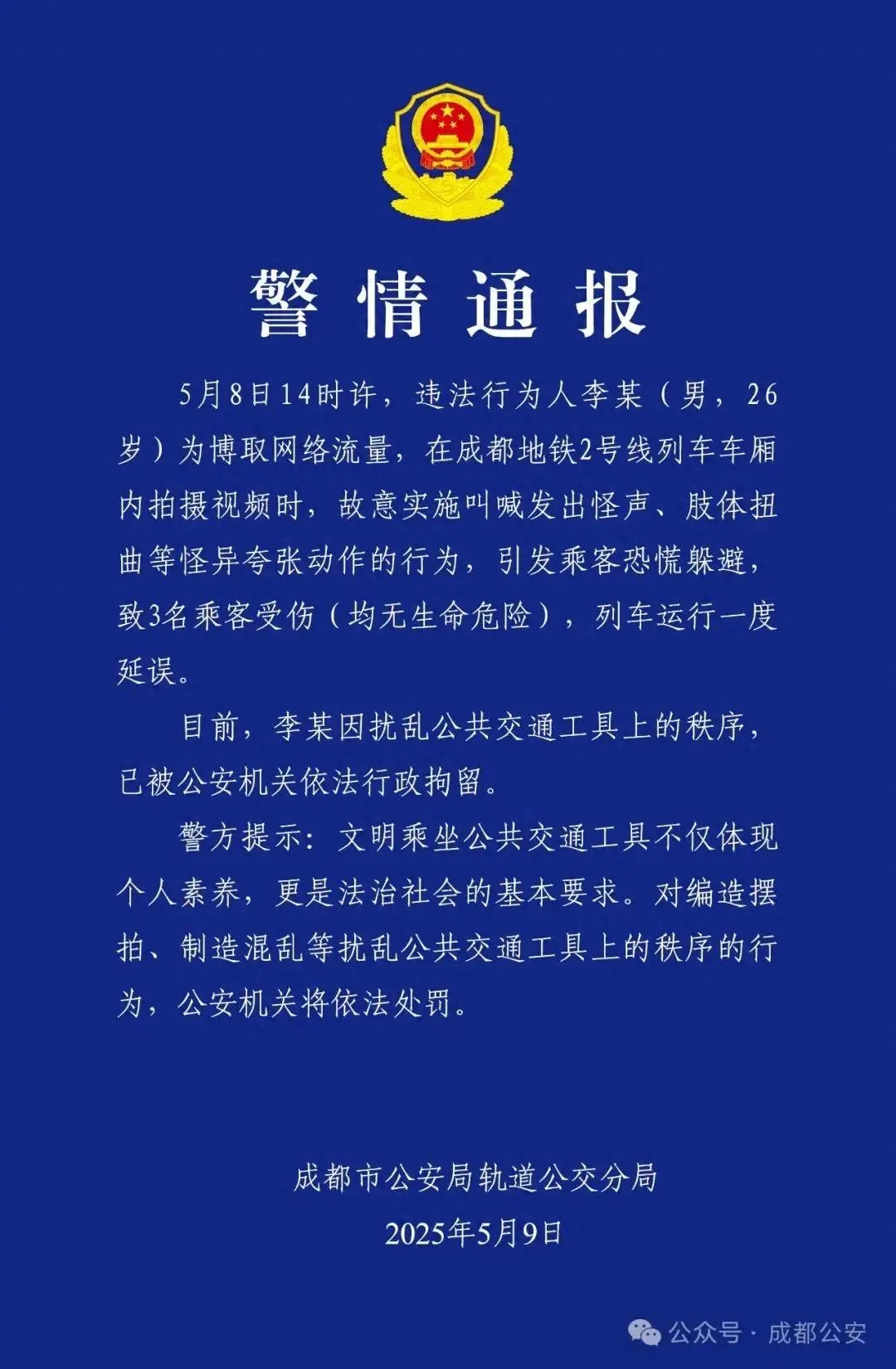 5月9日,成都警方通报:李某因扰乱公共秩序被行拘。这场"表演"的代价是3人受伤、列车延误,以及全网对畸形流量文化的又一次拷问。