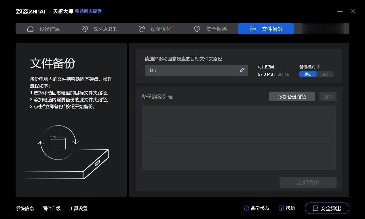 致态天枢大师移动固态硬盘的功能非常丰富,用户不仅可以看到移动固态硬盘的设备状态,包括健康度、已用空间、加密状态、S.M.A.R.T.信息,同时还提供了固件升级、设备优化、安全擦除、文件备份等功能,特别是安全擦除和文件备份功能,对于存储重要数据的用户来说非常方便。