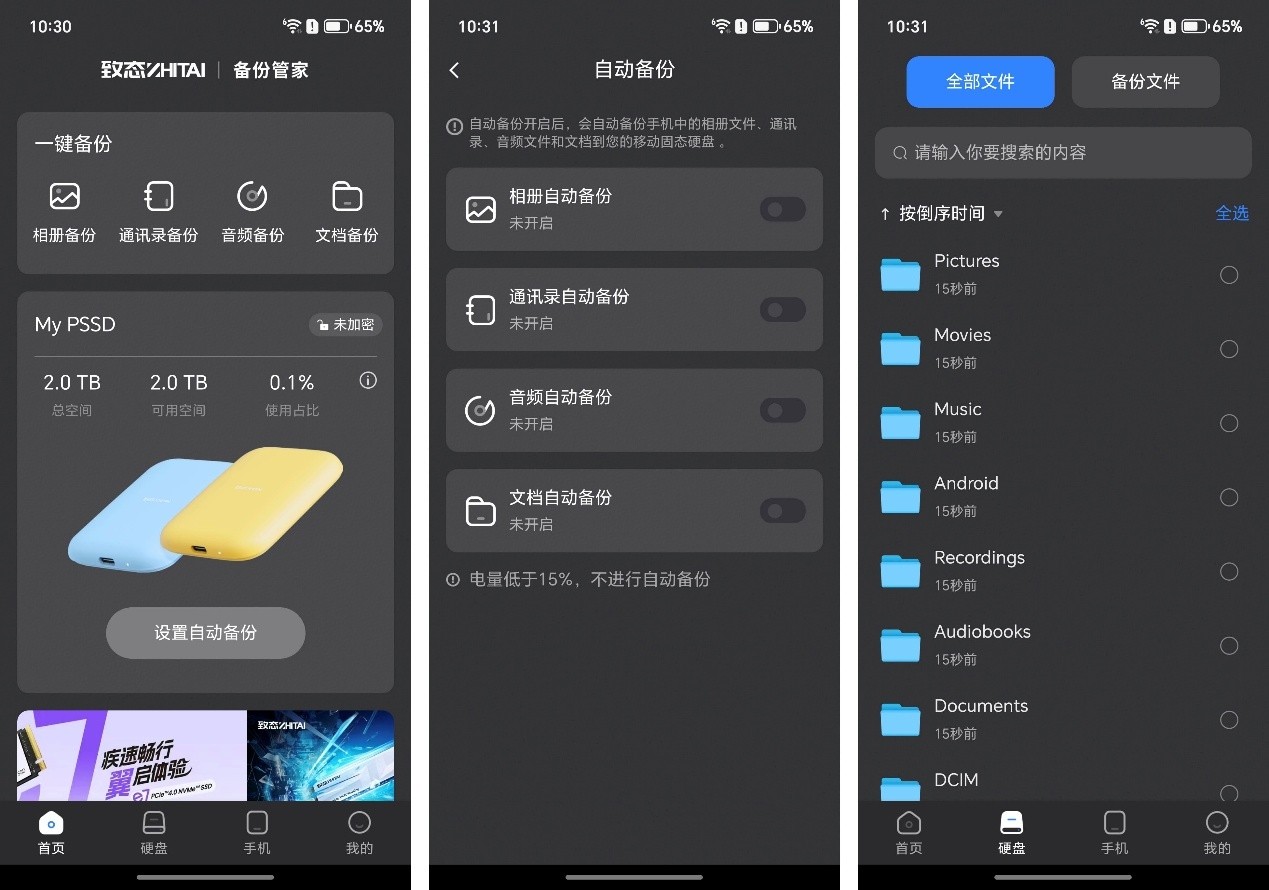 致态备份管家则是致态面向移动设备用户推出的软件,主要就是方便用户备份。目前推出了安卓和鸿蒙版本(支持鸿蒙4.0系统),暂时没有iOS版本。其提供了相册、通讯录、音频和文档备份,用户可以选择开启或关闭某个类型的备份。备份过程完全自动,操作简单,极大缓解了移动设备存储空间不足的问题。
