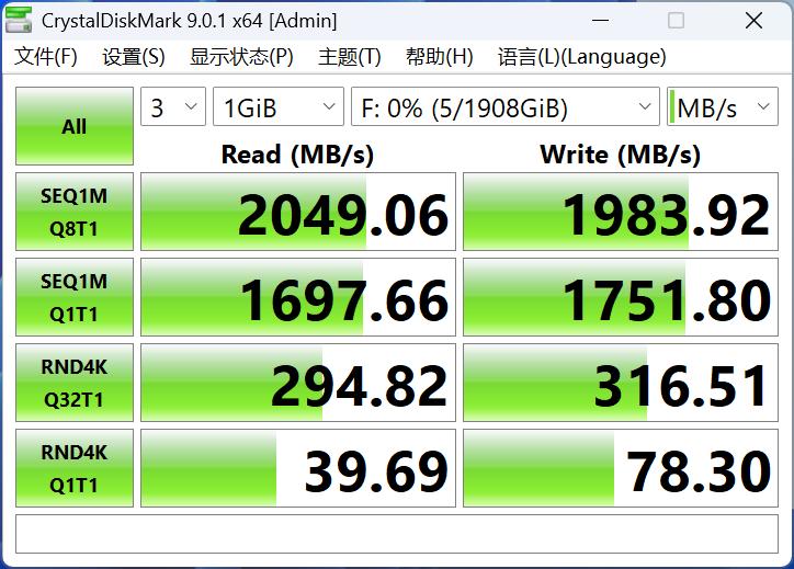 首先是CrystalDiskMark。实测得到顺序读取成绩为2049.06MB/s、顺序写入成绩为1983.92MB/s,完全符合官方宣称的2000MB/s。无论是传输视频素材,还是工作文件,致态灵·潮流版移动固态硬盘都会有着非常出众的传输效率。