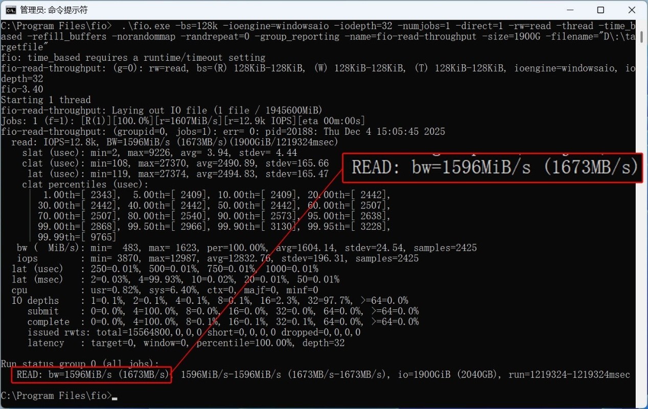 我们进一步探索了致态灵·潮流版移动固态硬盘的极限性能。使用fio进行了全盘读写测试,bs=128K,IO深度为32,其中写入数据量为1908GiB(2049GB),读取数据量为1900GiB(2040GB)。
