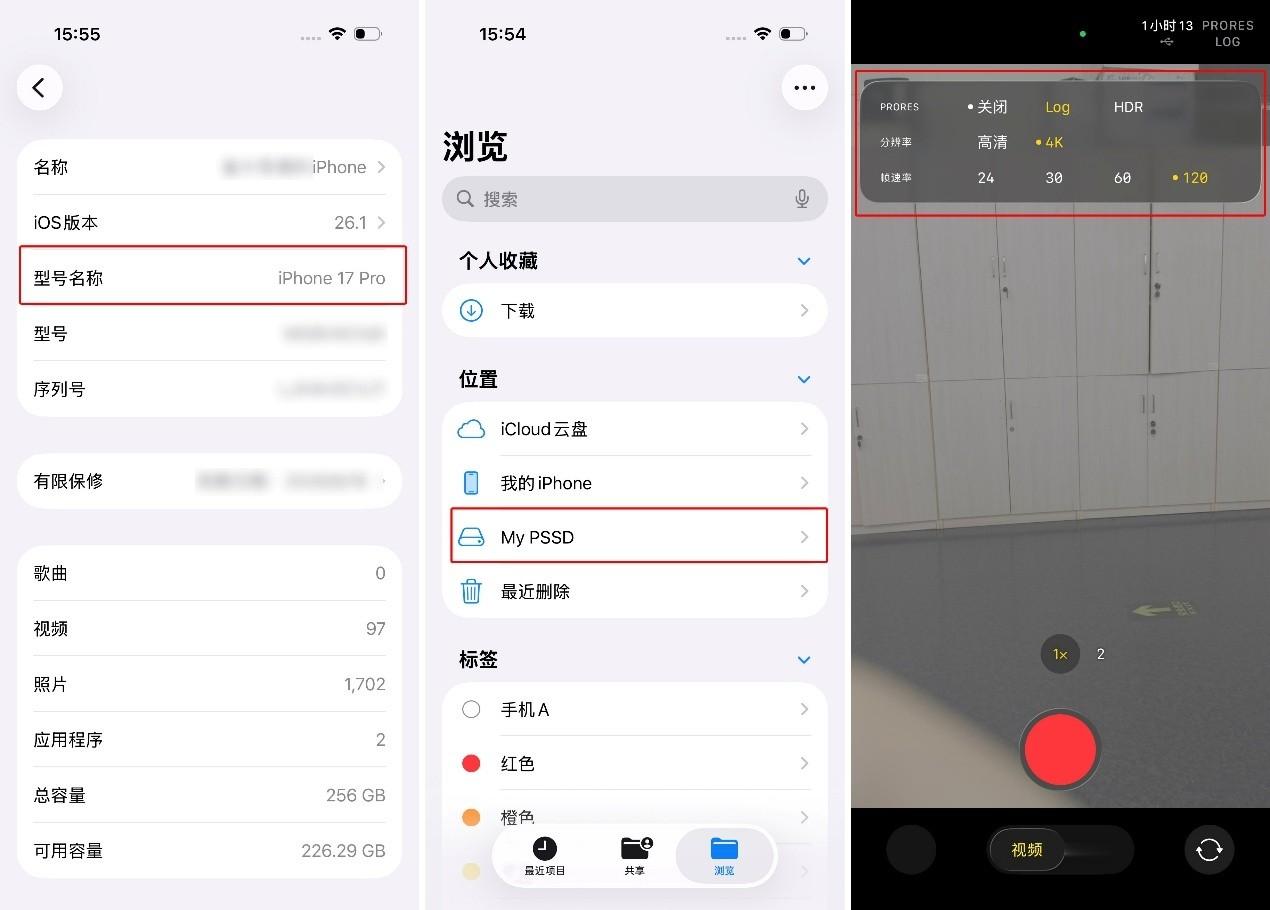 从测试的结果来看,四款设备均可以识别并存储文件,使用完全正常,兼容性非常不错。同时我们也专门测试了其对于iPhone 17 Pro机型视频拍摄的支持程度。使用iPhone 17 Pro原生相机的视频功能,可以正常开启4K 120帧PRORES Log选项,右上方也正常显示可拍摄视频素材的时长,其对于iPhone机型的支持还是很完善的。而且磁吸功能可以直接吸附在iPhone(iPhone15及以上机型)的后侧,移动创作更加方便。