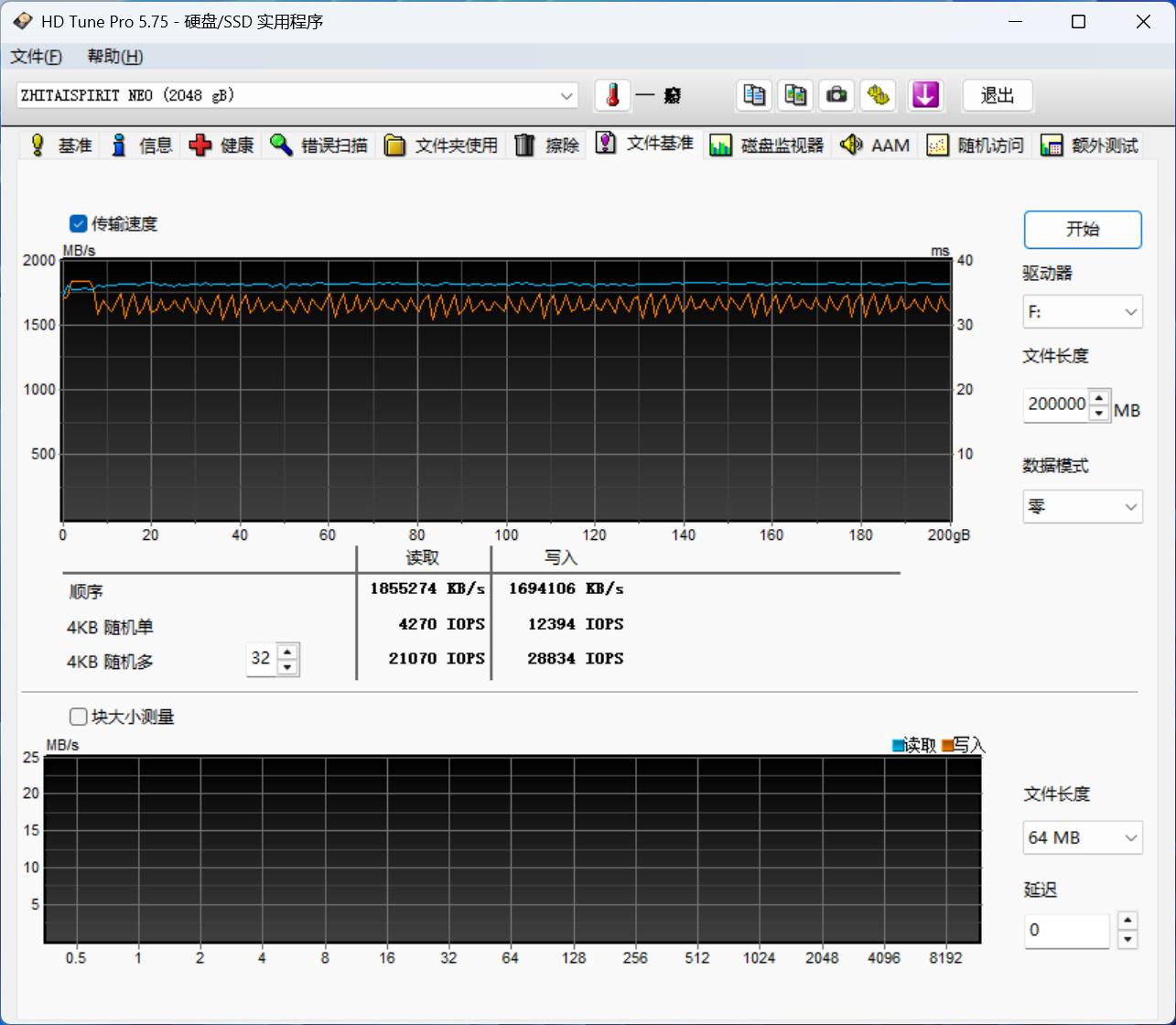 持续性能方面,通过HD Tune Pro持续读写200GB,从得到的曲线可以看到,全程没有掉速,表现相当惊艳。大多数用户单次传输文件的数据量应该低于200GB,这意味着绝大多数数据传输操作都可保持高速传输状态。