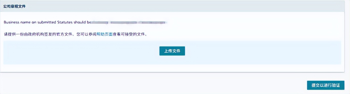 7. zui 后一步是需要提交公司章程文件,可以联系会计下载公司章程,核对公司章程里的营业执照和法人信息,上传文件那里以PDF版本上传已下载的公司章程,然后点击“提交以进行验证”就可以了。