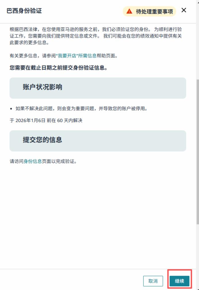 3. 在政策合规性页面可以看到巴西身份验证那里有个红色感叹号,点击下感叹号右面的箭头: