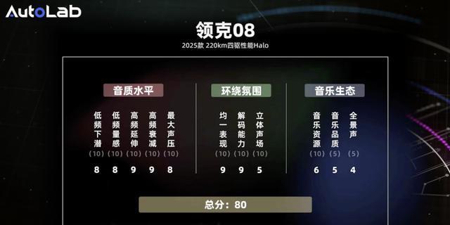 最后,我们亲自测试后,发现领克08在AudioLab 2.0的打分体系里,总共拿了80分。