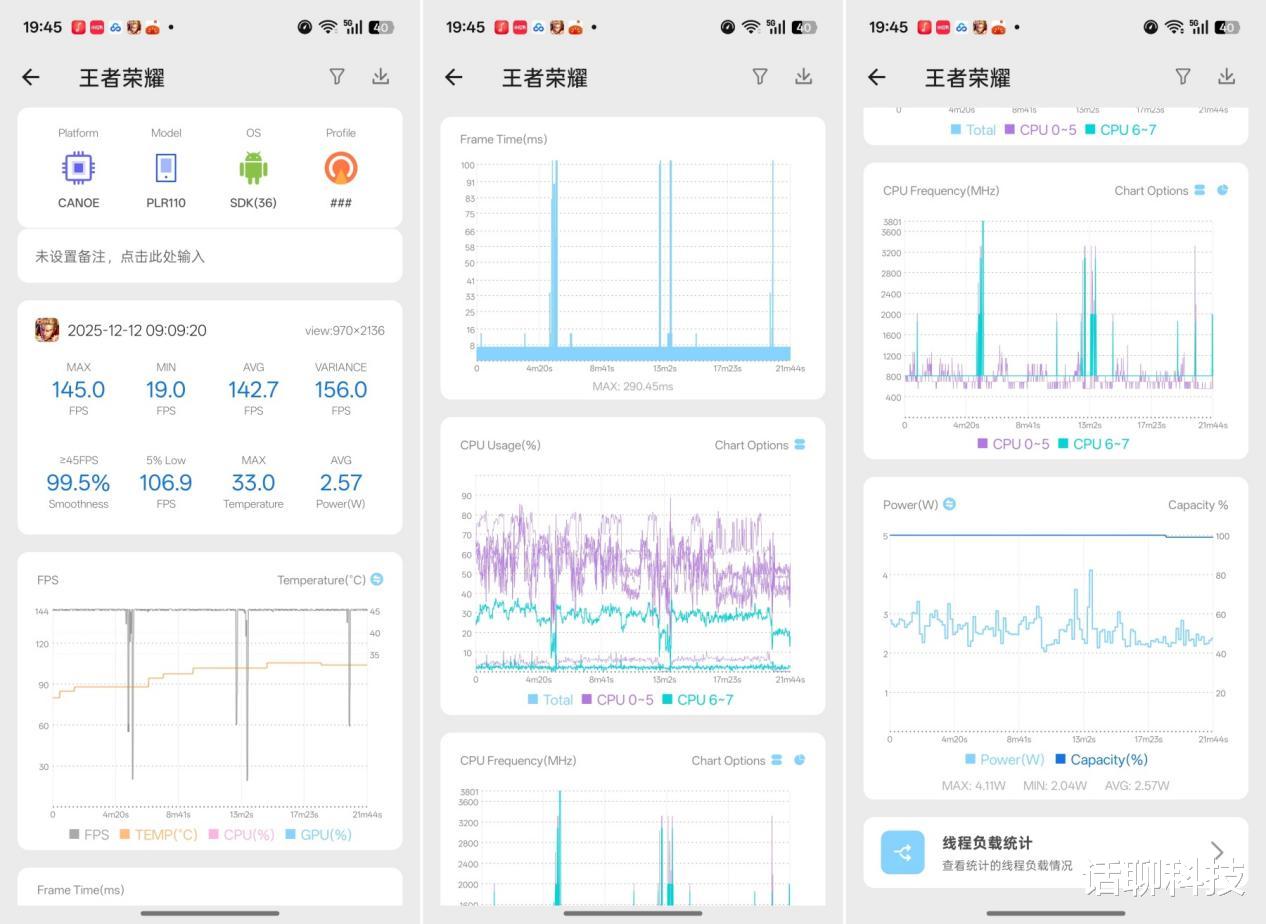 对于国民游戏《王者荣耀》,其也支持开启144帧+极致画质模式,总人体表现也是,最大145FPS、平均142.7FPS,至于其中的几次掉帧,实际上不是游戏卡顿,是我边测试边玩游戏,心不在焉玩死了英雄,复活瞬间的游戏停顿。这点其实从CPU功率占用也能分析出来,因为掉帧的前后CPU功耗并不大。