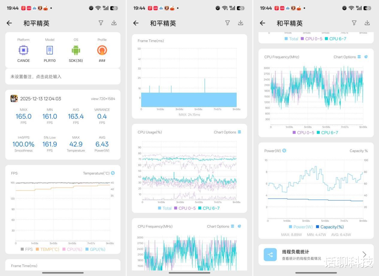 至于热功耗,其内置超大尺寸VC液冷散热模块,配合高导热系数的散热材料,散热效率大幅提升,在手机高性能模式下,实测144帧+极致画质模式运行《王者荣耀》1小时,用红外温度枪实测手机正面最高温度45.2℃,背面最高温度46.3℃,握持时仅能感受到轻微温热,完全不烫手,也没有出现因温度过高导致的降频卡顿,散热系统表现稳定。