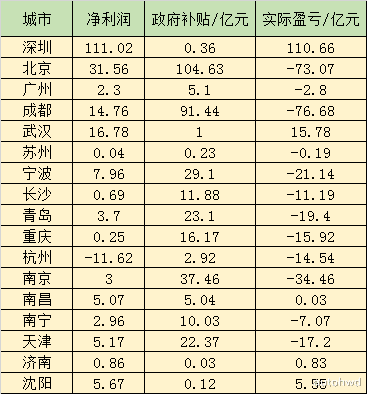 我们这些城市的盈利情况,我们会发现除了直辖市外,南京达到-34.46亿,成都达到-76.68亿高居榜首 ,同样是计划单列城市,青岛和宁波差不多,达到-19.4亿和-21.14亿。但还是一些城市收益不错,武汉达到15.78亿,沈阳达到5.55亿,苏州南昌和济南成绩也是不错的。
