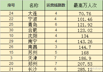 我们再看地铁日最高客运量达到100万到300万的城市,(因为制表失误,大连统计错了),这些上榜的城市经济发达,要么是省会城市,要么是直辖市或计划单列城市,其中长沙的日最高客运量最高达到280多万,而天津虽然也达到186万,但相比较其他直辖市有点偏少。