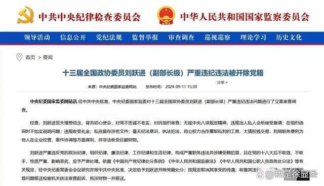 中央纪委国家监委网站9月11日通报,十三届全国政协委员刘跃进(副部长级)严重违纪违法被开除党籍。