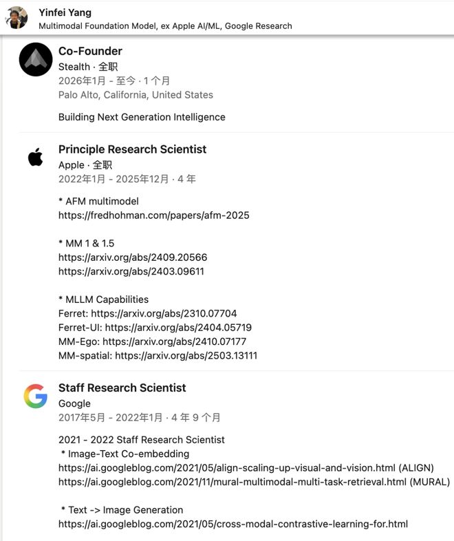 YinfeiYang此前在苹果机器学习团队担任首席研究科学家(PrincipalResearchScientist),主要参与苹果自研AI模型的开发。